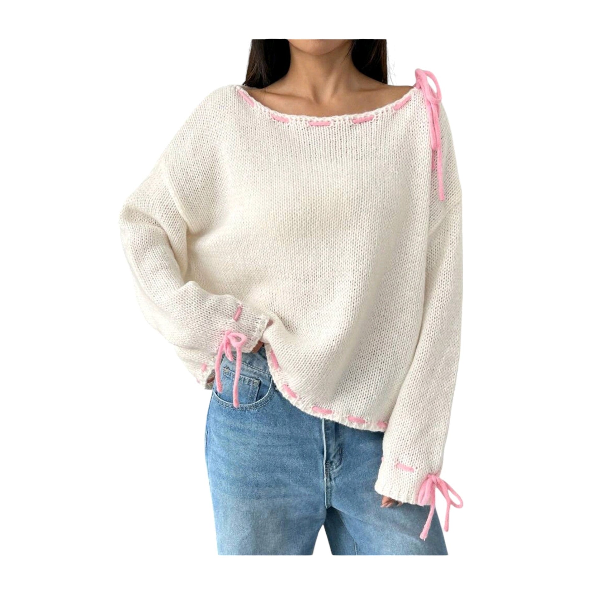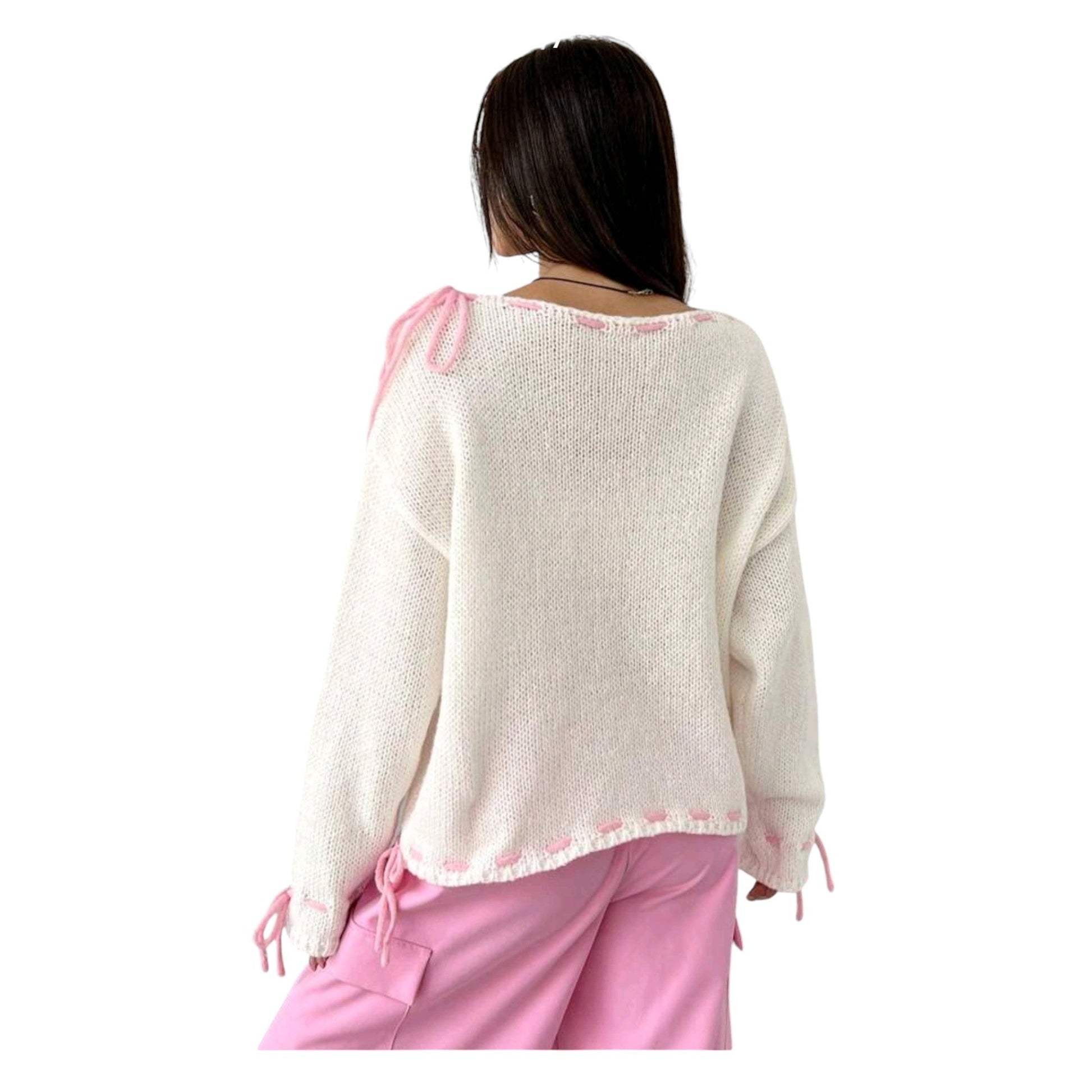 Címke nélküli, fehér, rózsaszín szegéllyel, hosszú ujjú, kerek nyakú, kötős részletekkel.