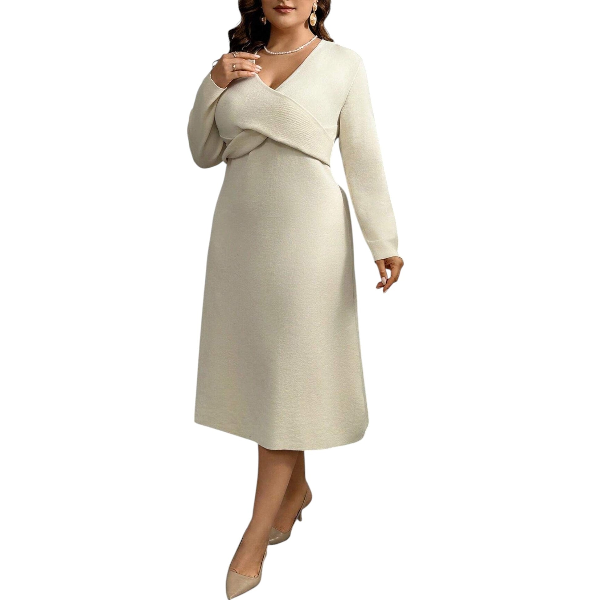 Címke nélküli, bézs, hosszú ujjú, V-nyakú, kötött, átlapolt midi ruha.