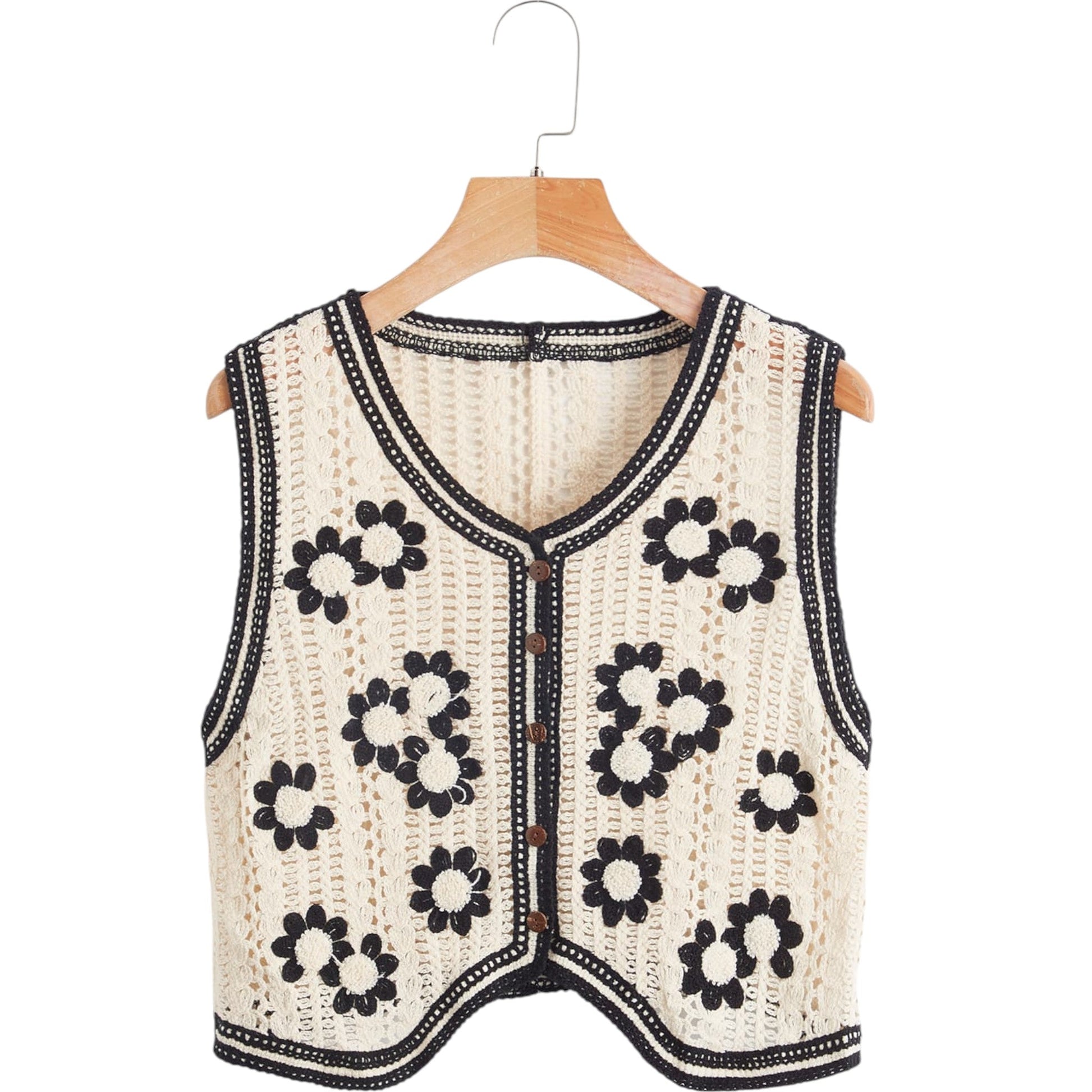 Címke nélküli, bézs alapon fekete virágmintás, horgolt mellény, gombos záródással.