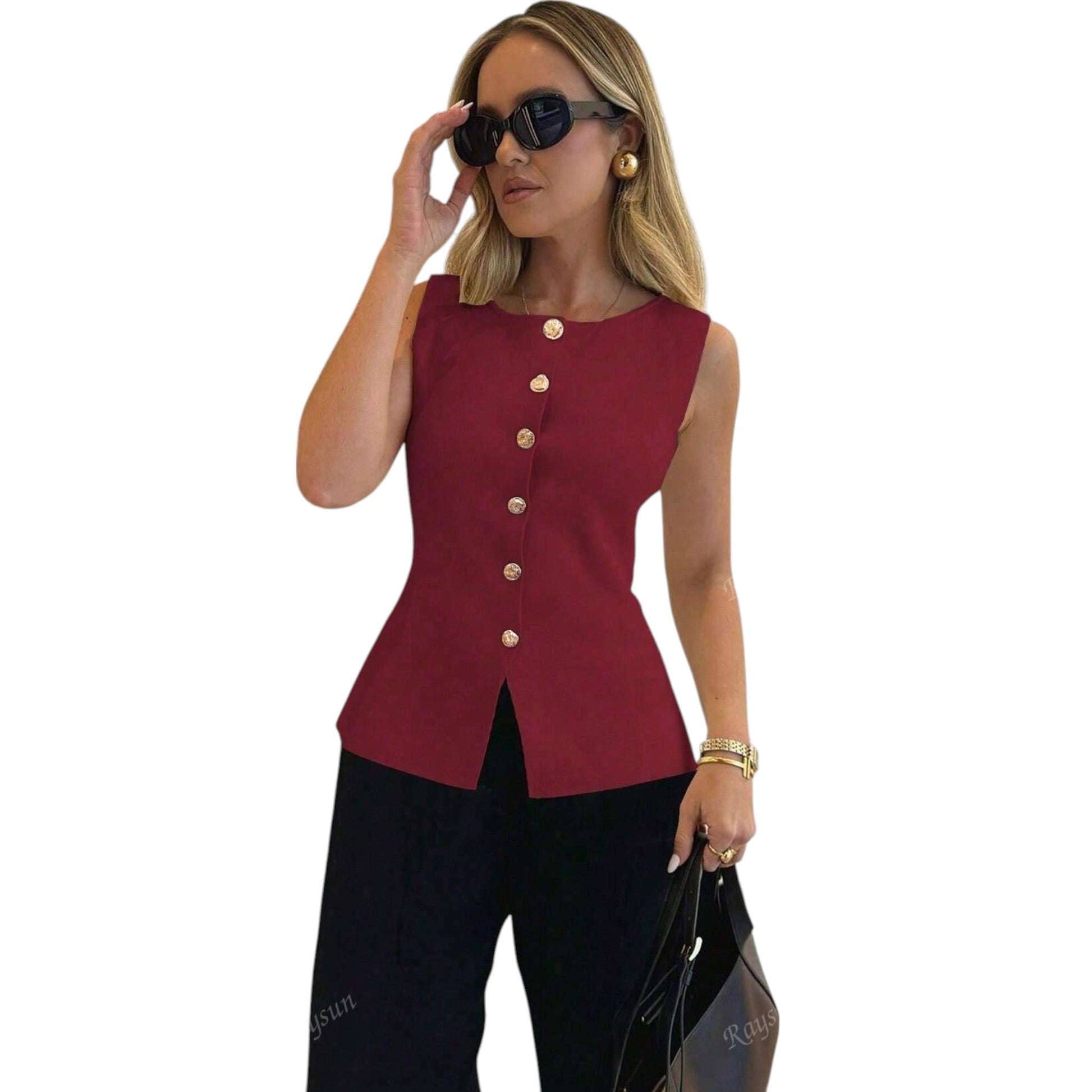 Címke nélküli, bordó, ujjatlan, kerek nyakú mellény, elöl arany színű gombokkal, rövid szabású.