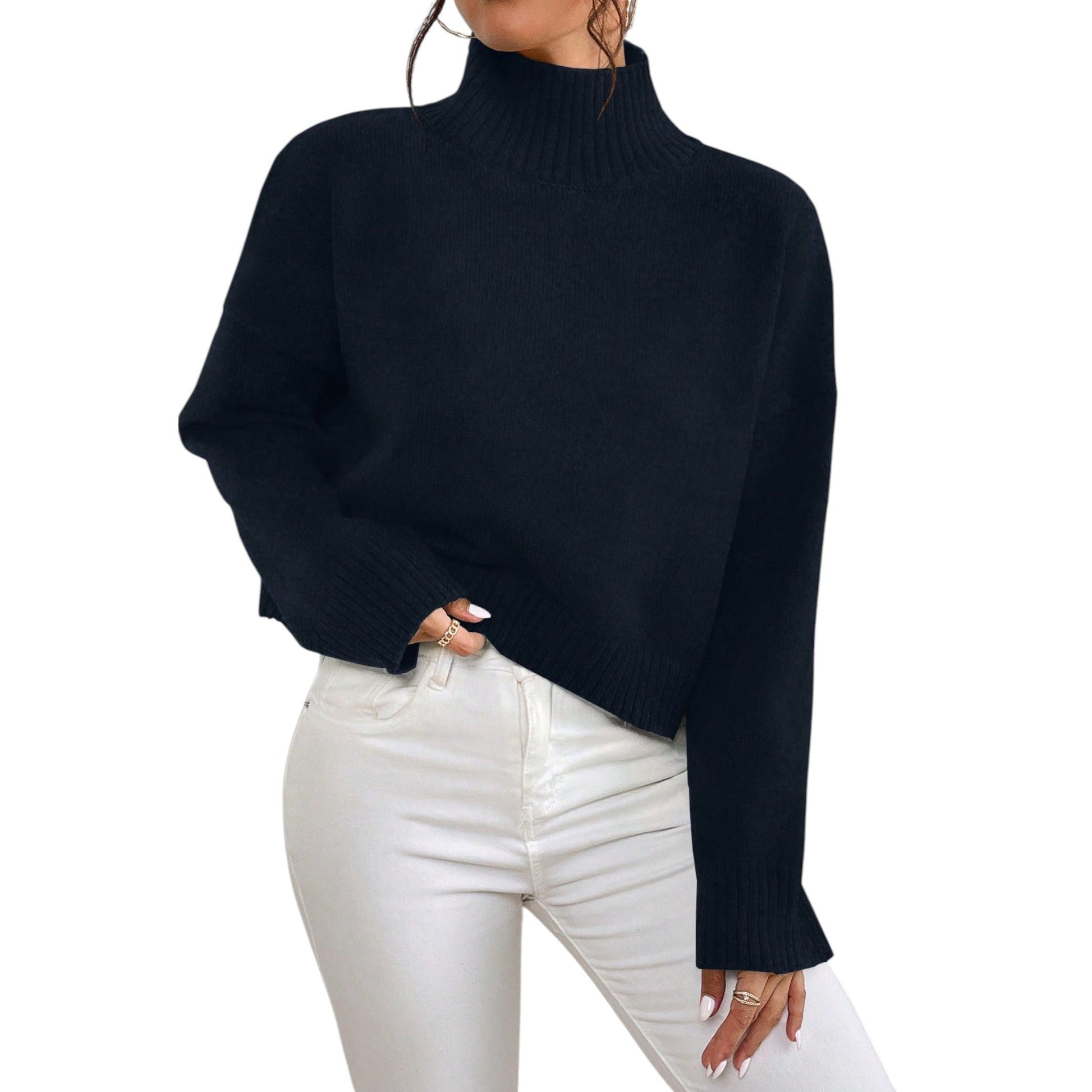 Címke nélküli, fekete, magas nyakú kötött pulóver. Hosszú ujjú, ejtett vállú, bő szabású.