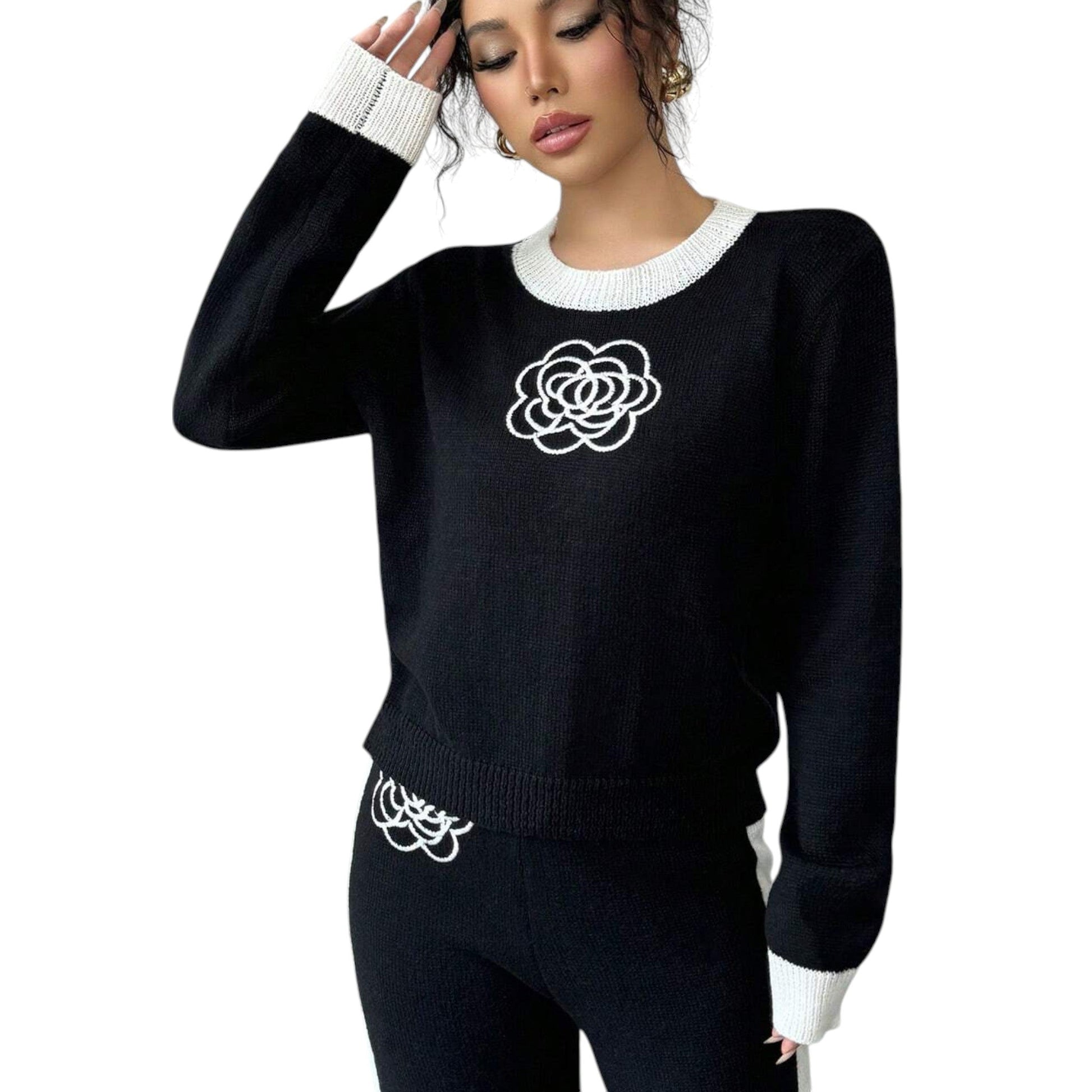 Címke nélküli, fekete, fehér szegélyű, hímzett virágmintás, kerek nyakú, hosszú ujjú kötött pulóver.