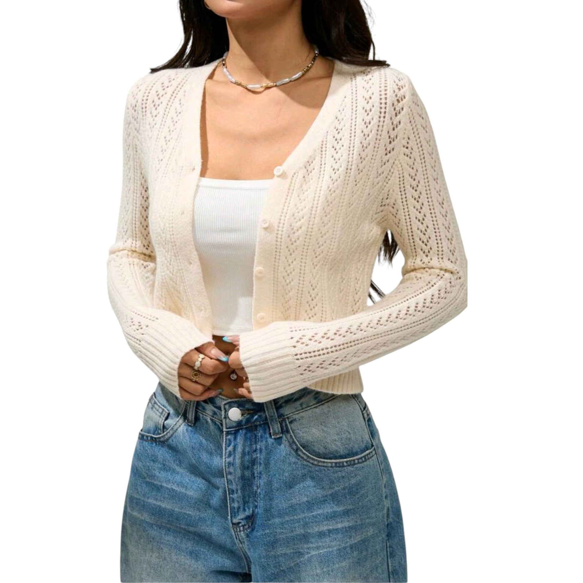 Címke nélküli, bézs, V-nyakú, gombos, hosszú ujjú, kötött kardigán.