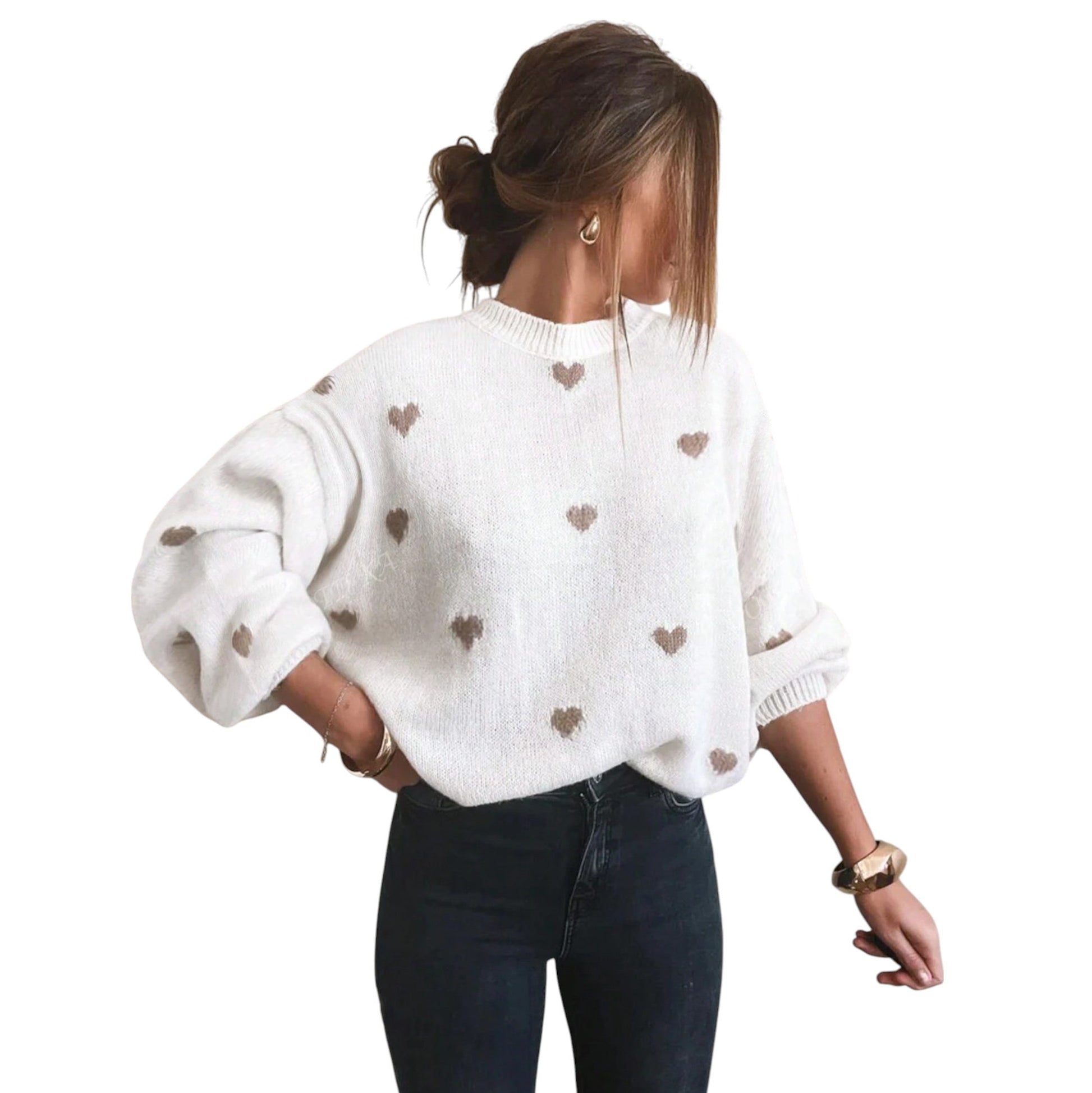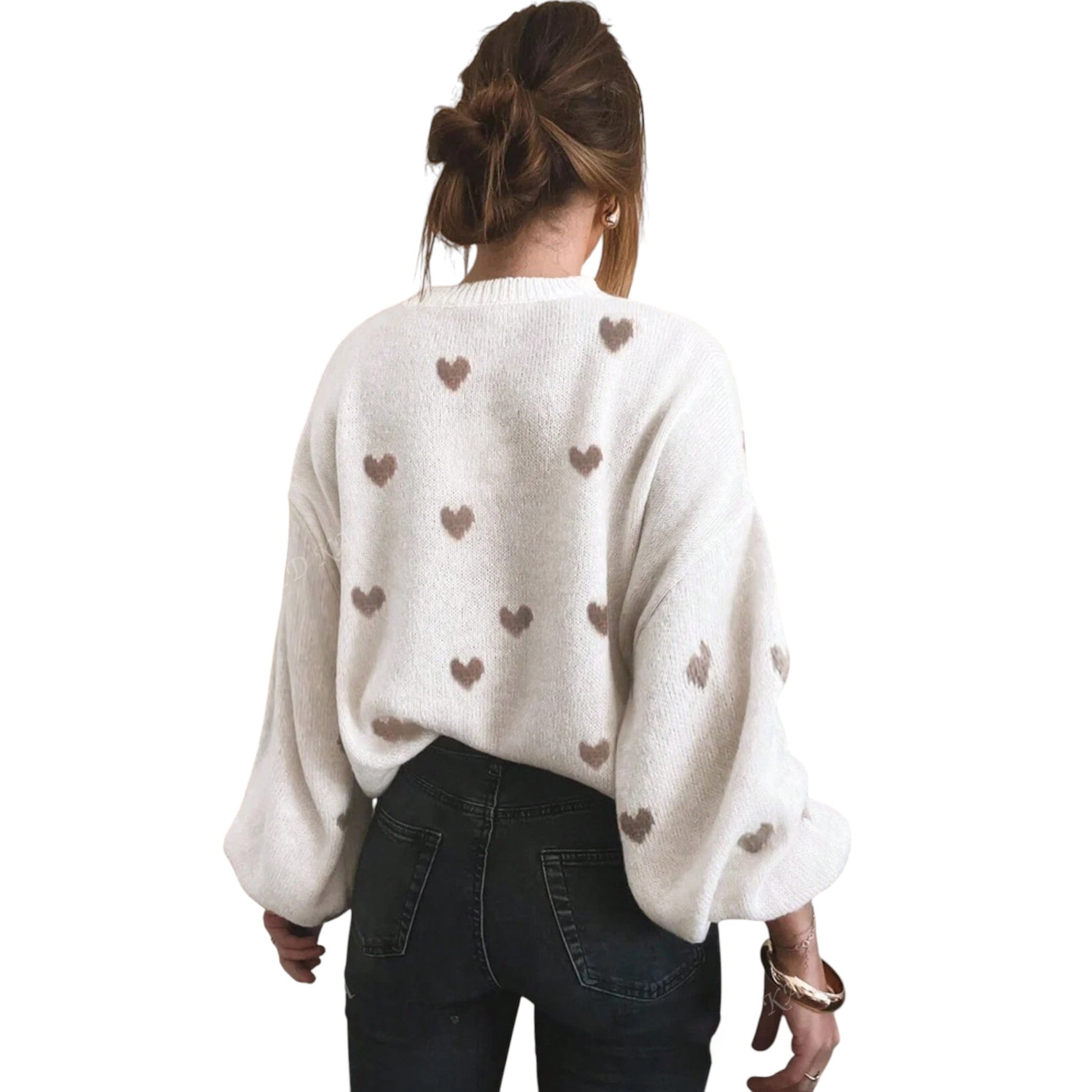 Címke nélküli, fehér, hosszú ujjú, kerek nyakú, bő szabású, barna szívmintákkal díszítve.