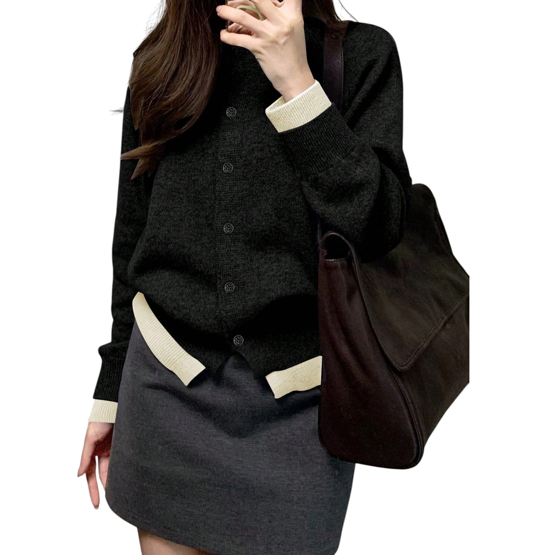 Címke nélküli, fekete, kötött, hosszú ujjú, gombos kardigán, bézs szegéllyel a mandzsettán és az alján.