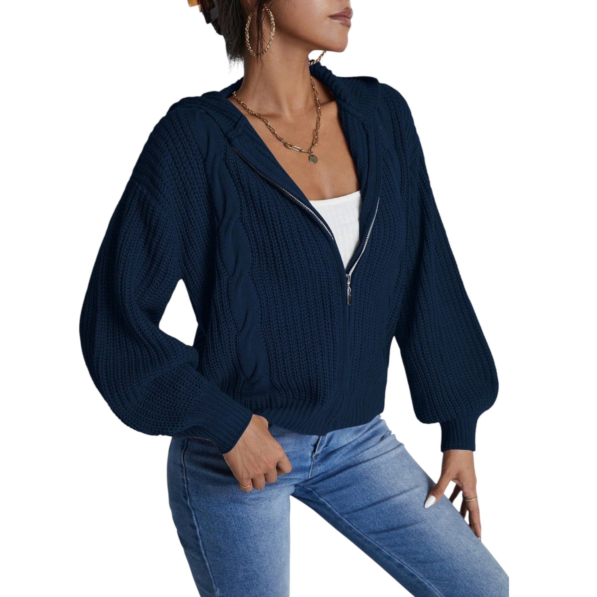 Címke nélküli, fekete, kötött, cipzáros, hosszú ujjú, kapucnis, ejtett vállú, bordázott passzéval.