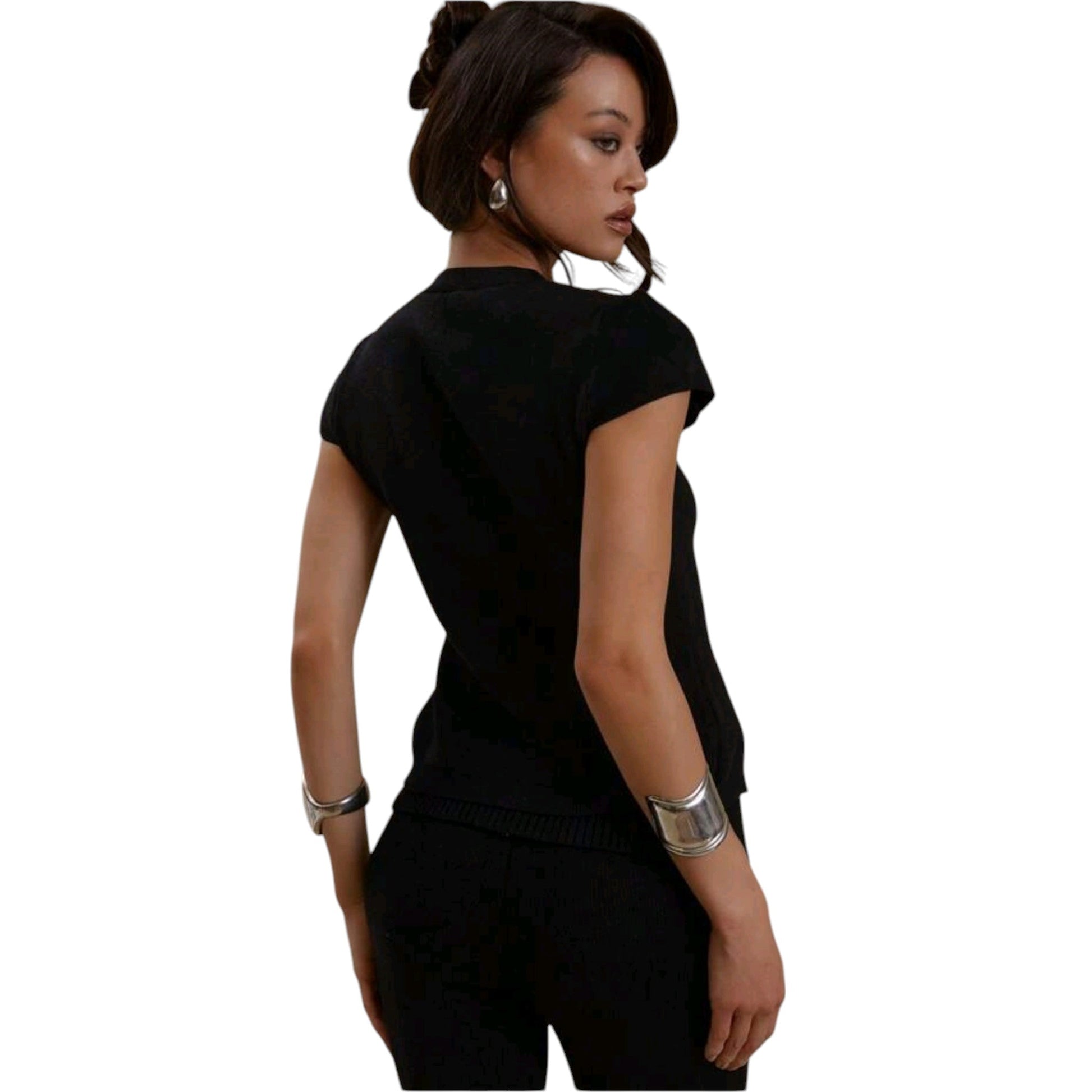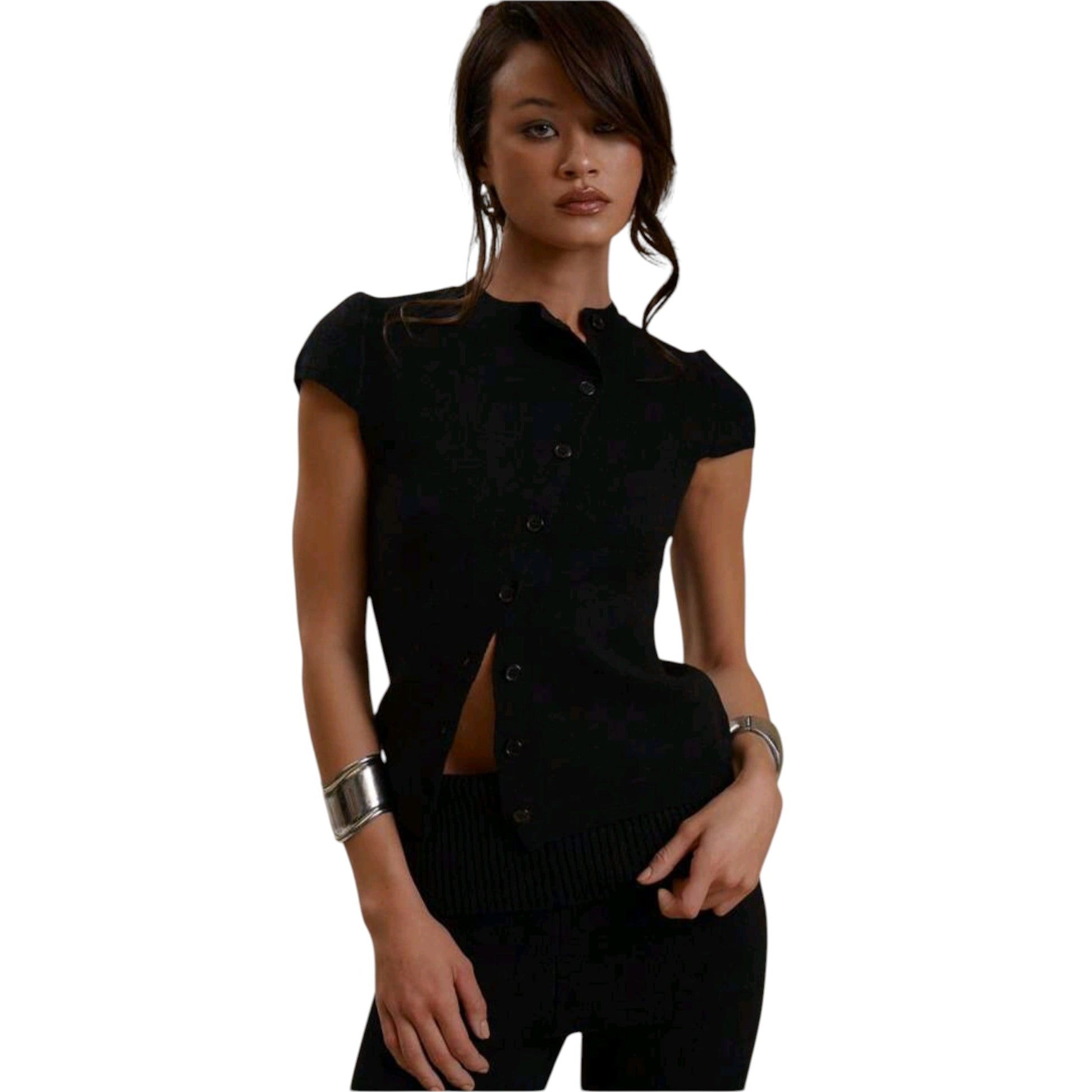 Címke nélküli, fekete, rövid ujjú, gombos blúz.