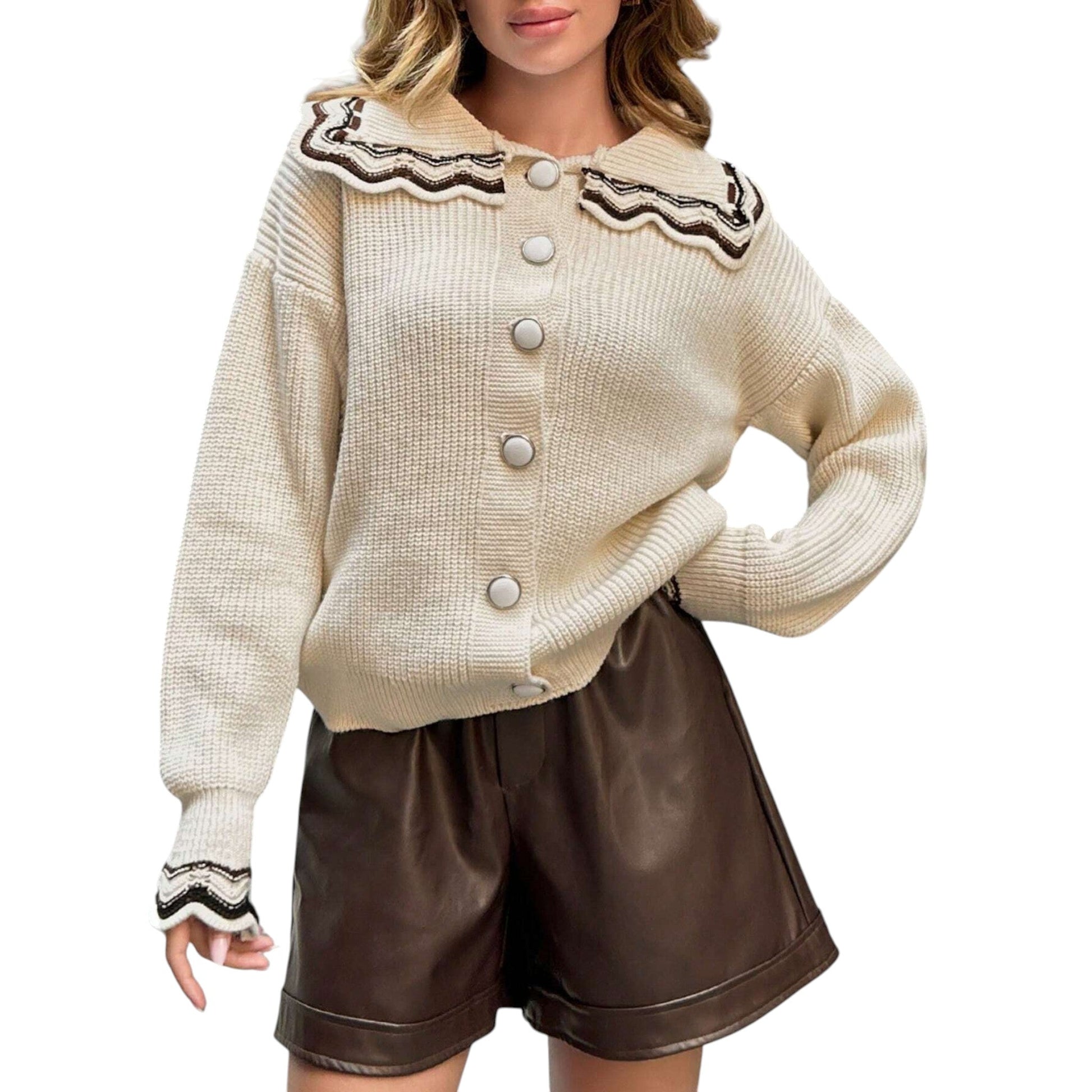 Címke nélküli, ekrü, kötött, hosszú ujjú, gombos, fodros gallérral, csíkos mintával a galléron és a mandzsettán.