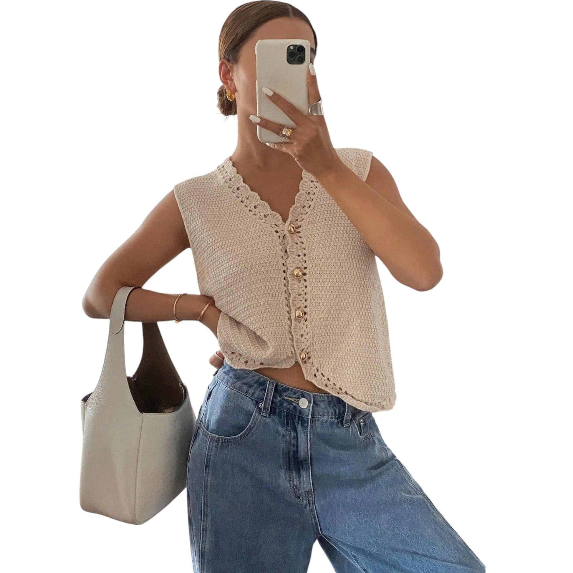 Címke nélküli, bézs, kötött, ujjatlan felső, V-nyakkivágással és gombos elülső résszel, valamint fodros szegéllyel.
