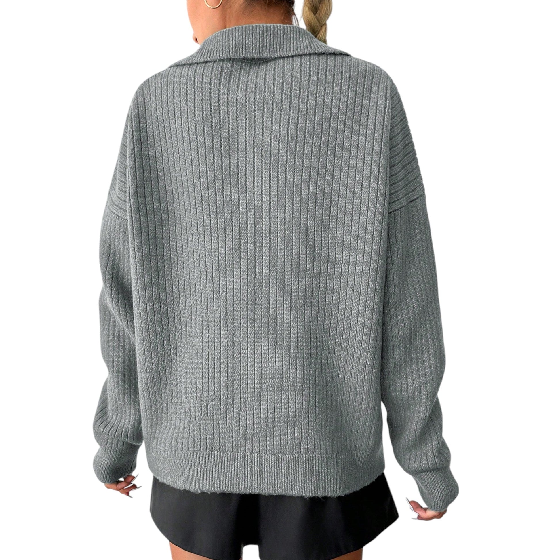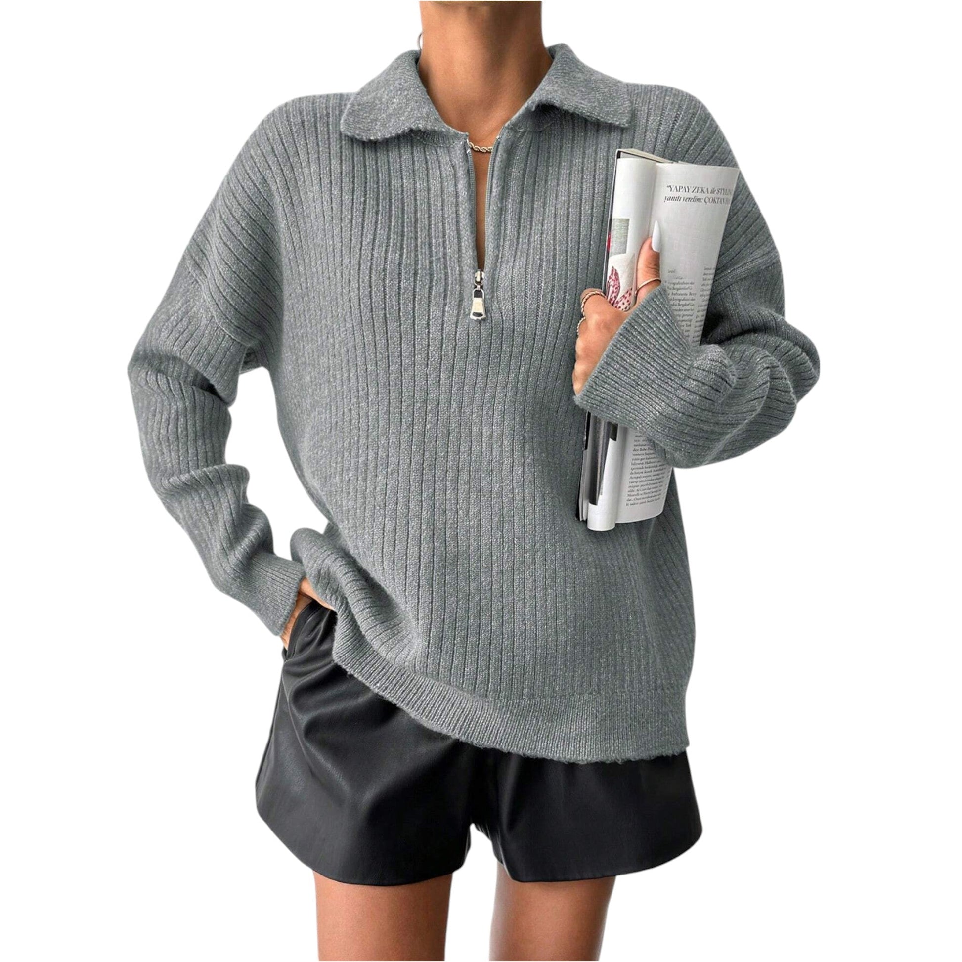 Címke nélküli, szürke, bordázott kötött pulóver. Hosszú ujjú, galléros, elöl rövid cipzárral. Bő szabású.