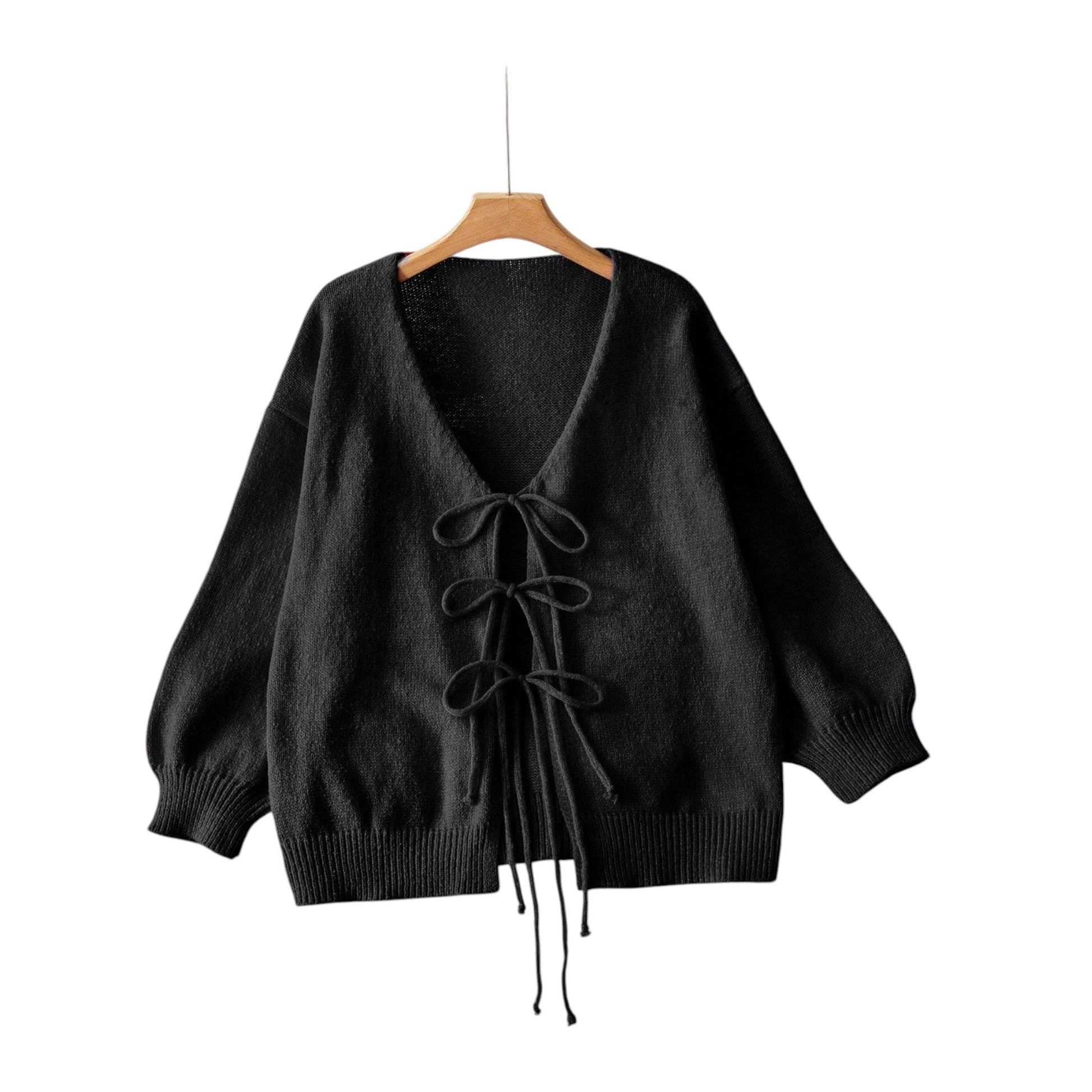 Címke nélküli, fekete, kötött kardigán, V-nyakú, hosszú ujjú, elől megkötős.