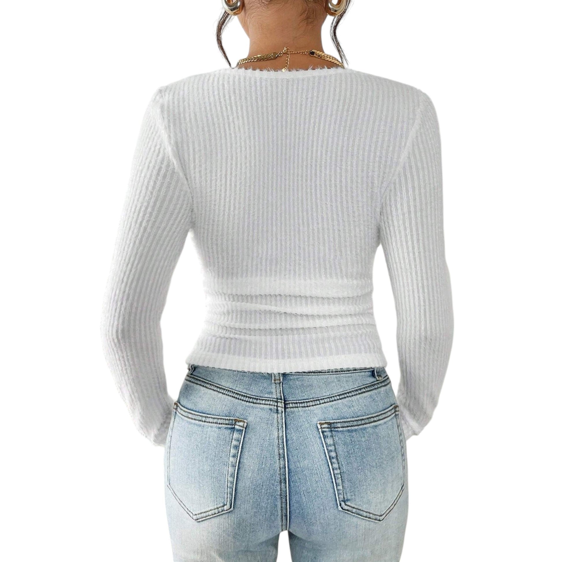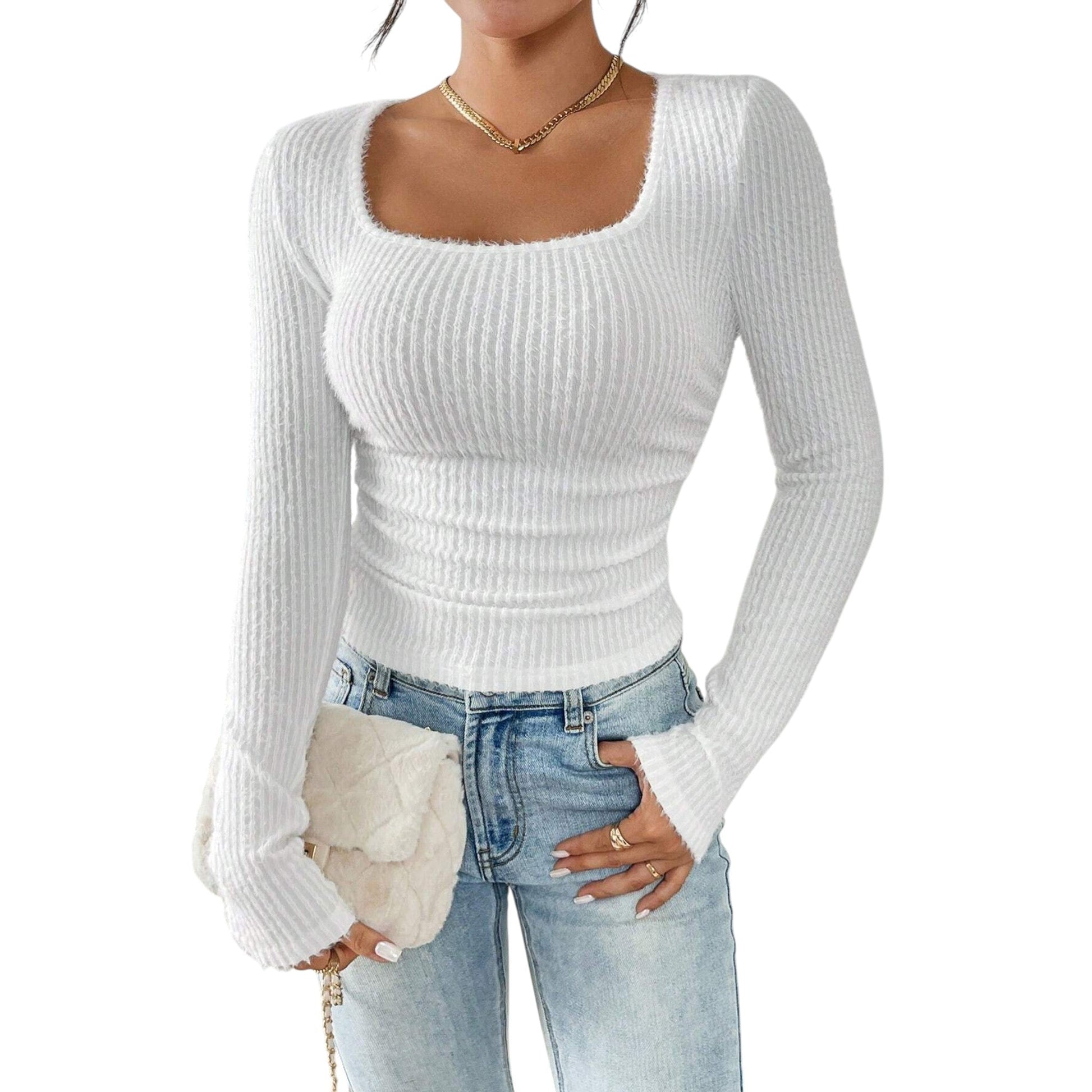 Címke nélküli, fehér, bordázott, hosszú ujjú felső, szögletes nyakkivágással.