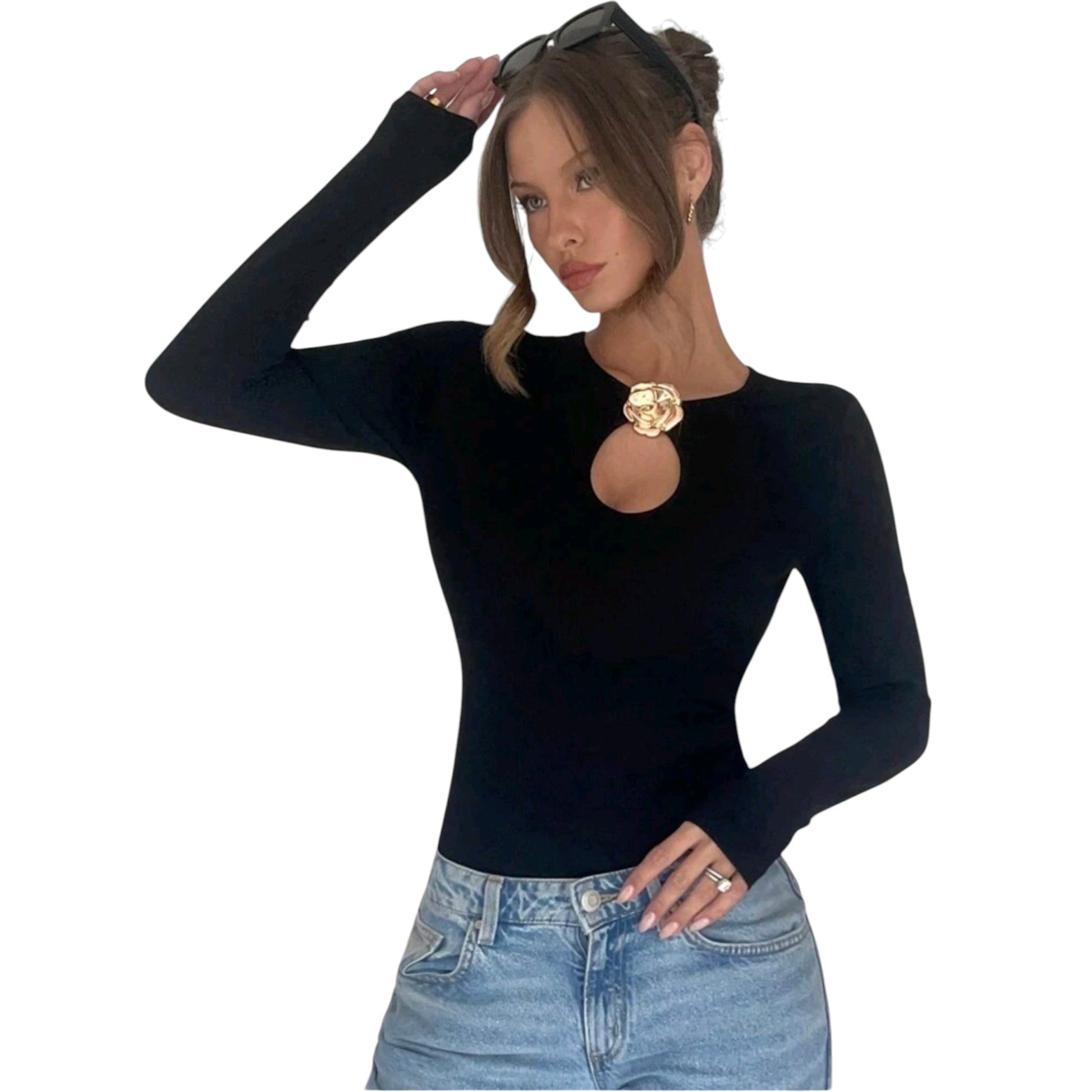 Címke nélküli, fekete, kerek nyakú, hosszú ujjú felső, elöl kivágással.