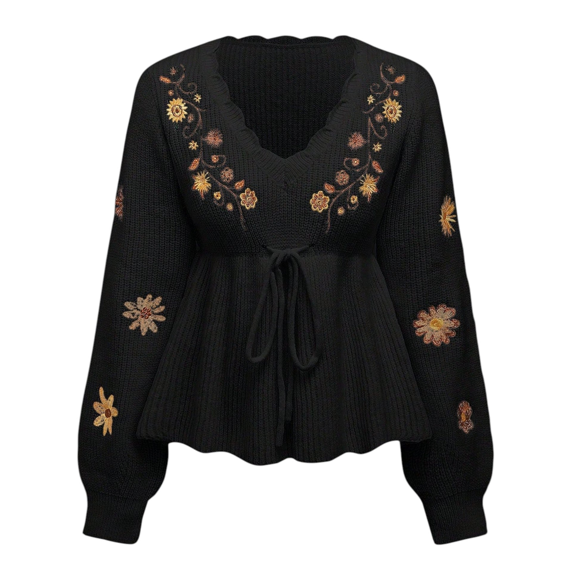 Címke nélküli, fekete, hosszú ujjú, hímzett kötött pulóver, V-nyakú, megkötős derékkal és fodros szegéllyel.