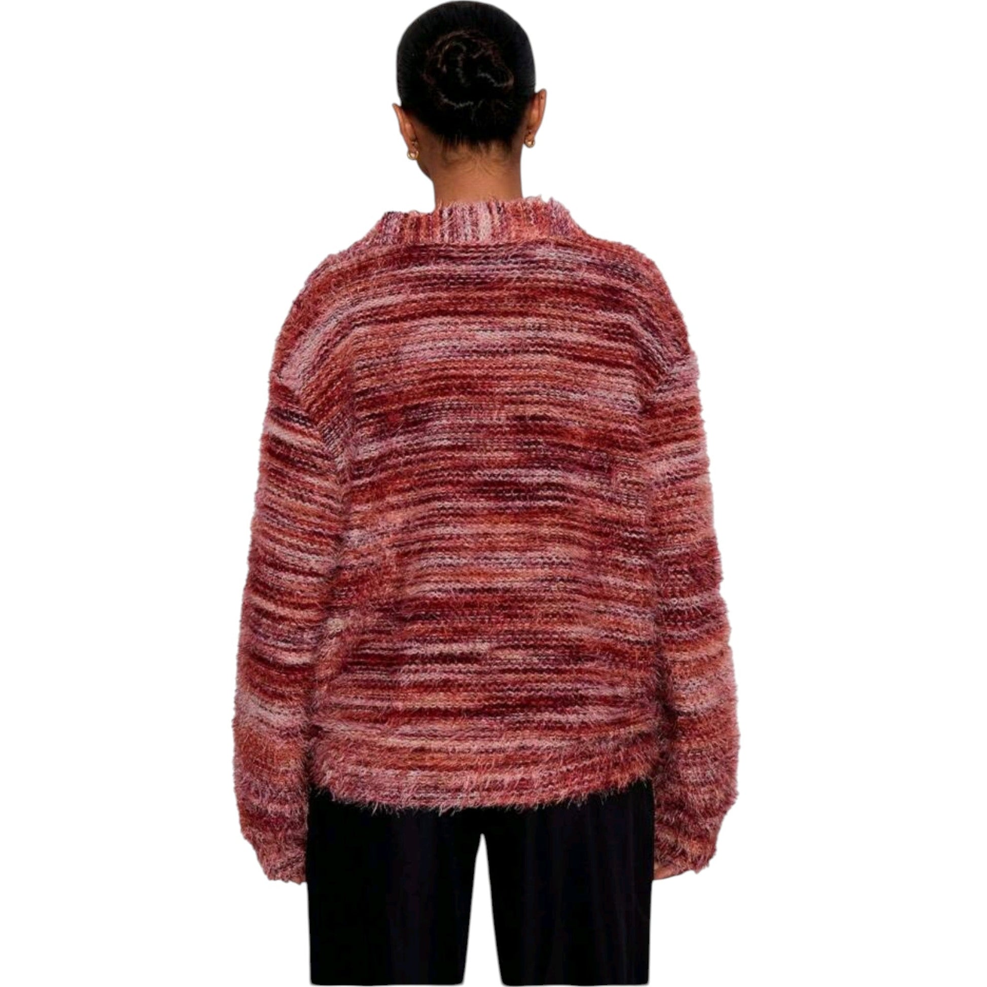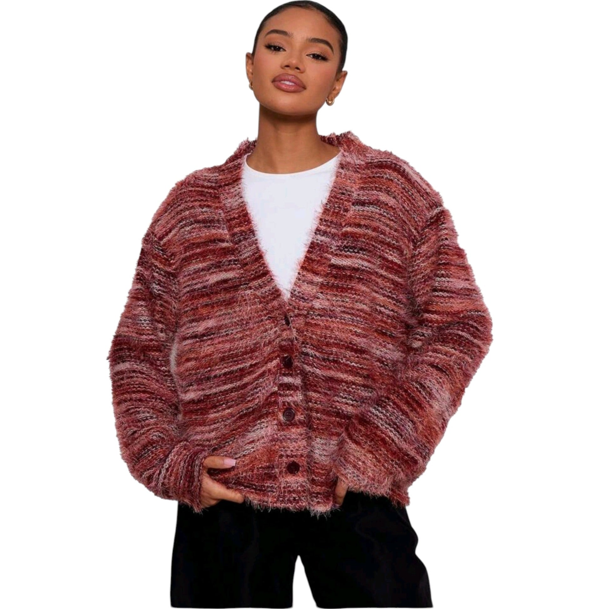 Címke nélküli, piros árnyalatú, V-nyakú, gombos, hosszú ujjú, bolyhos kötött kardigán.