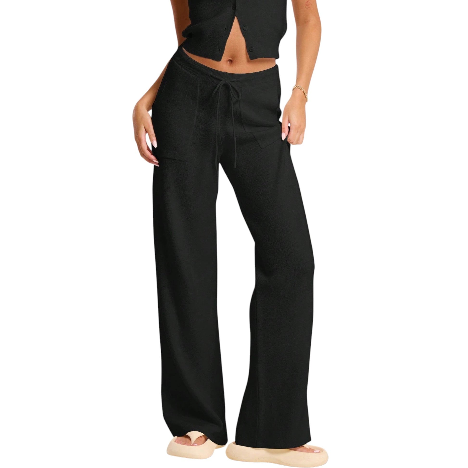 Címke nélküli, fekete, bordás kötött, magas derekú, széles szárú nadrág megkötős derékkal, zsebekkel.