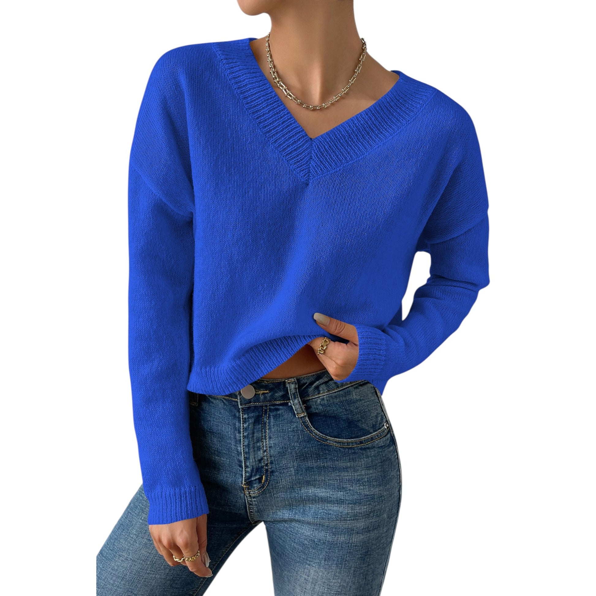 Címke nélküli, kék, hosszú ujjú, V-nyakú, kötött, rövid szabású pulóver.