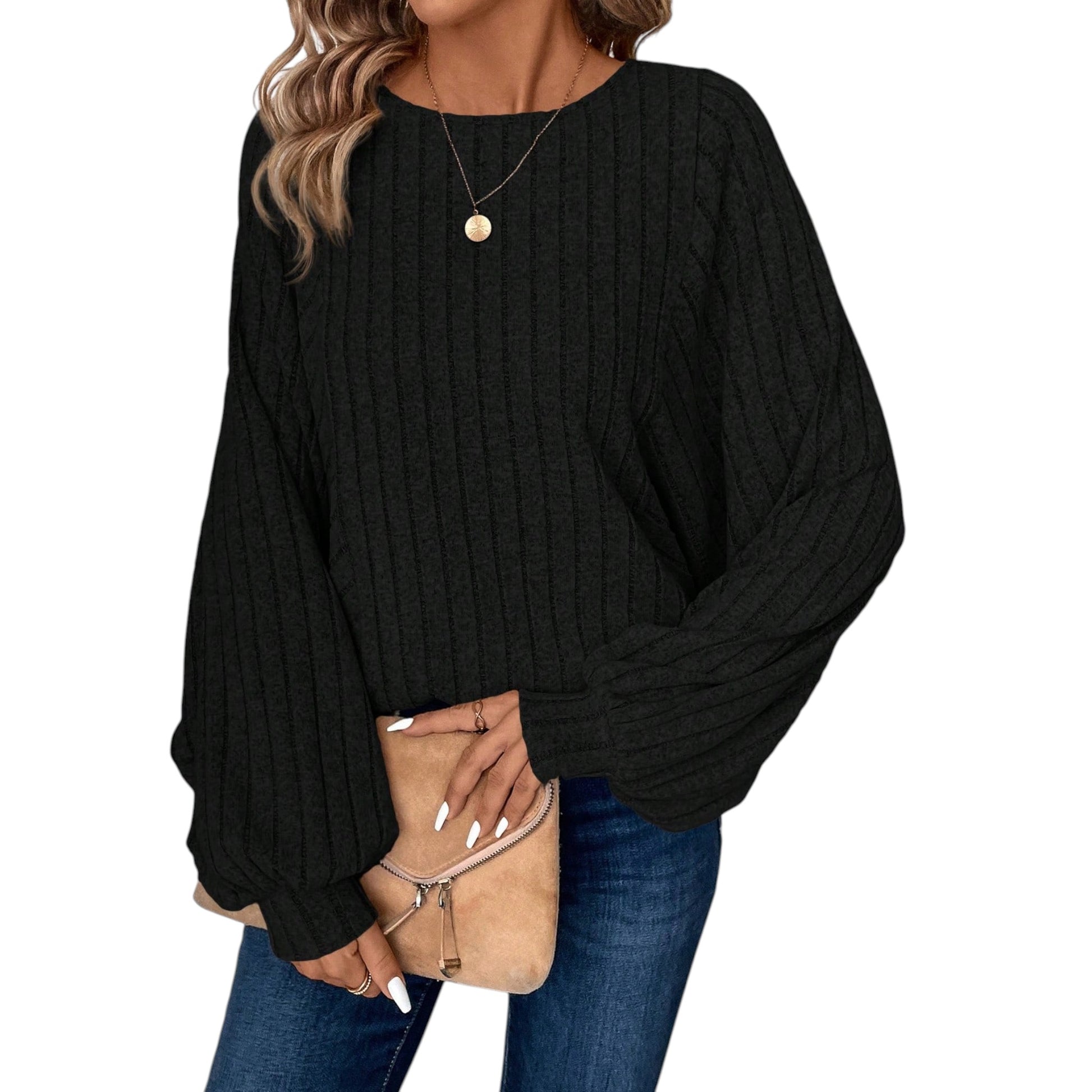 Címke nélküli, fekete, kötött, kerek nyakú, hosszú puffos ujjú pulóver.