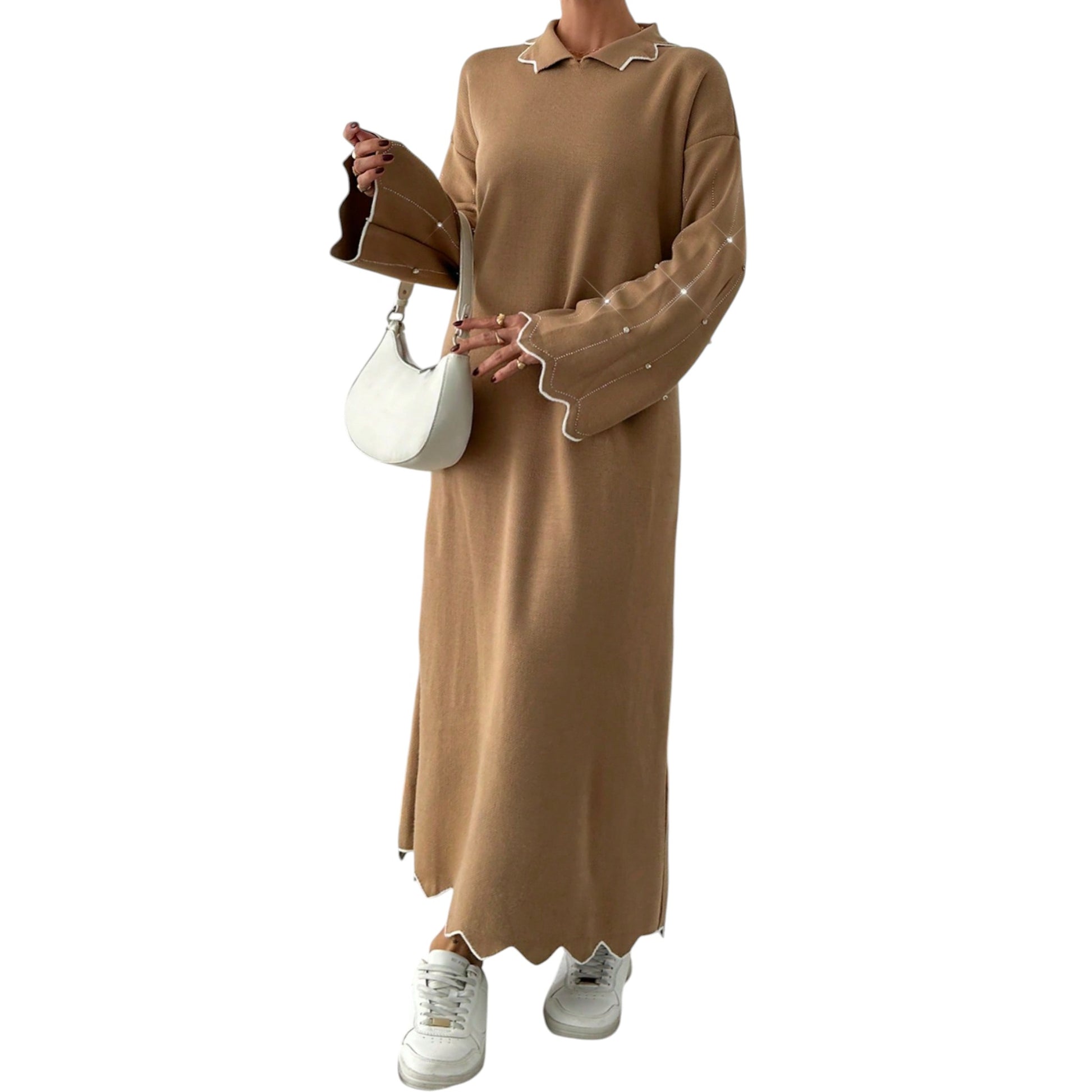 Címke nélküli, barna, hosszú ujjú, kötött, maxi ruha, fehér szegéllyel a galléron, az ujjakon és a ruha alján.