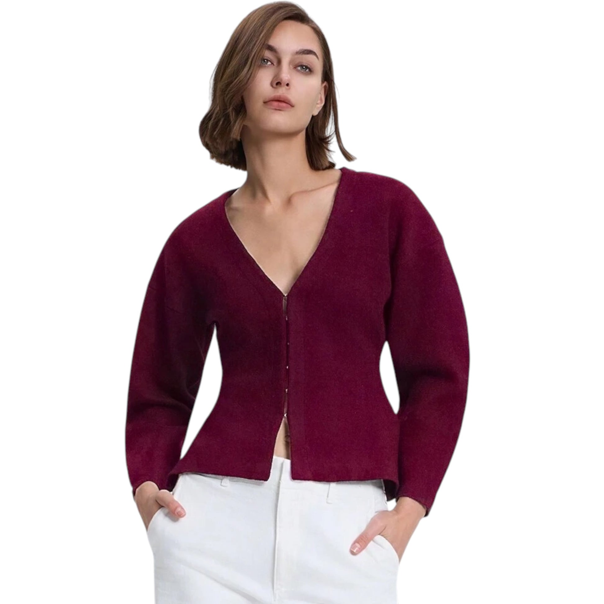 Címke nélküli, bordó, kötött, hosszú ujjú, V-nyakú, elöl cipzáros kardigán.