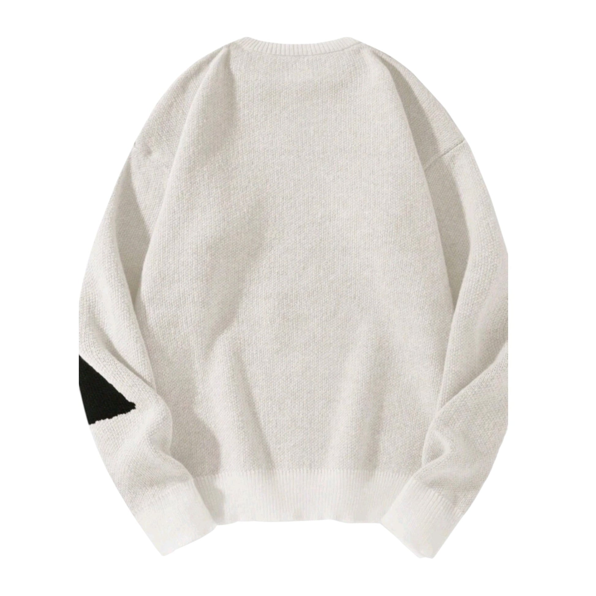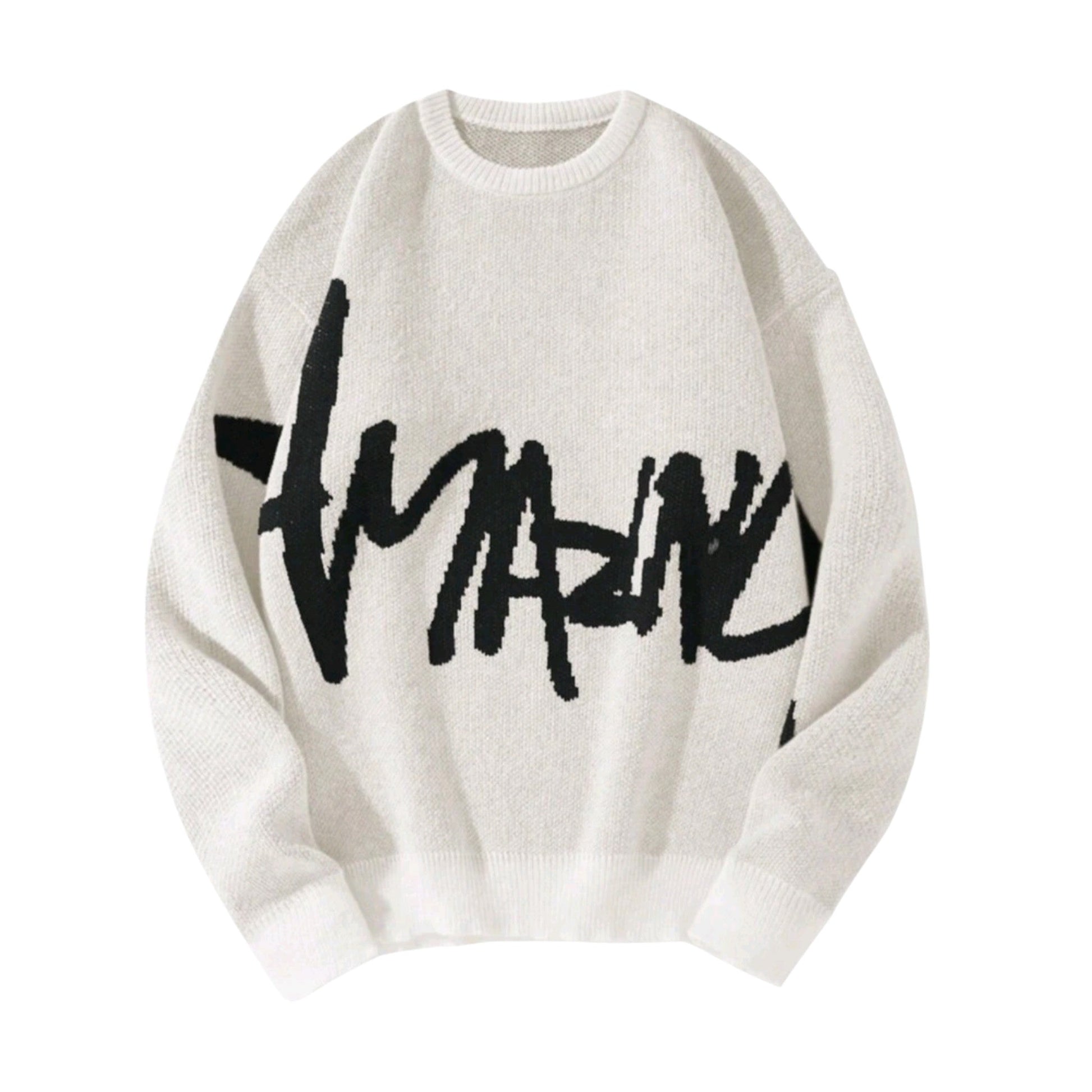 Címke nélküli, fehér, kerek nyakú, hosszú ujjú, kötött pulóver fekete felirattal.