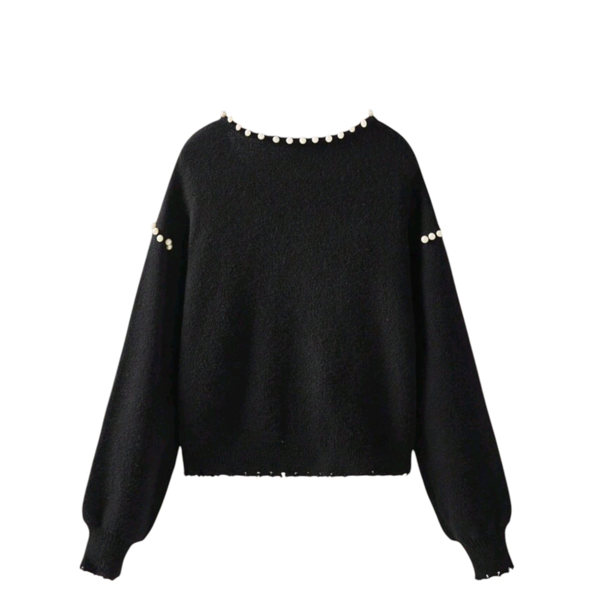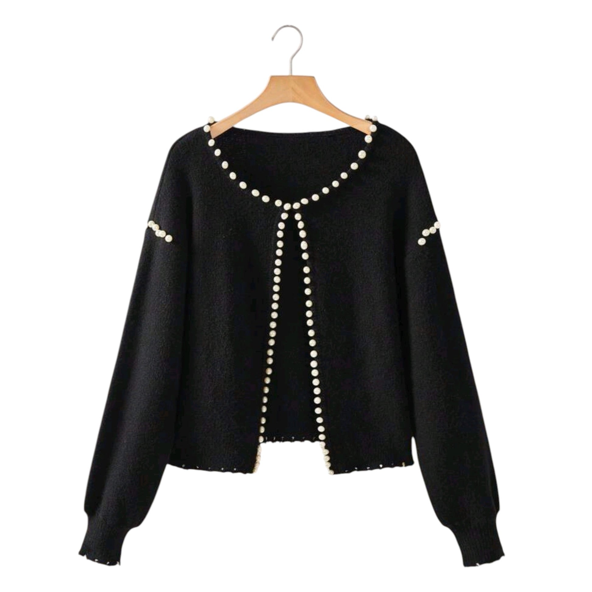 Címke nélküli, fekete, kerek nyakú, hosszú ujjú, gyöngy díszítésű, gombos kardigán.