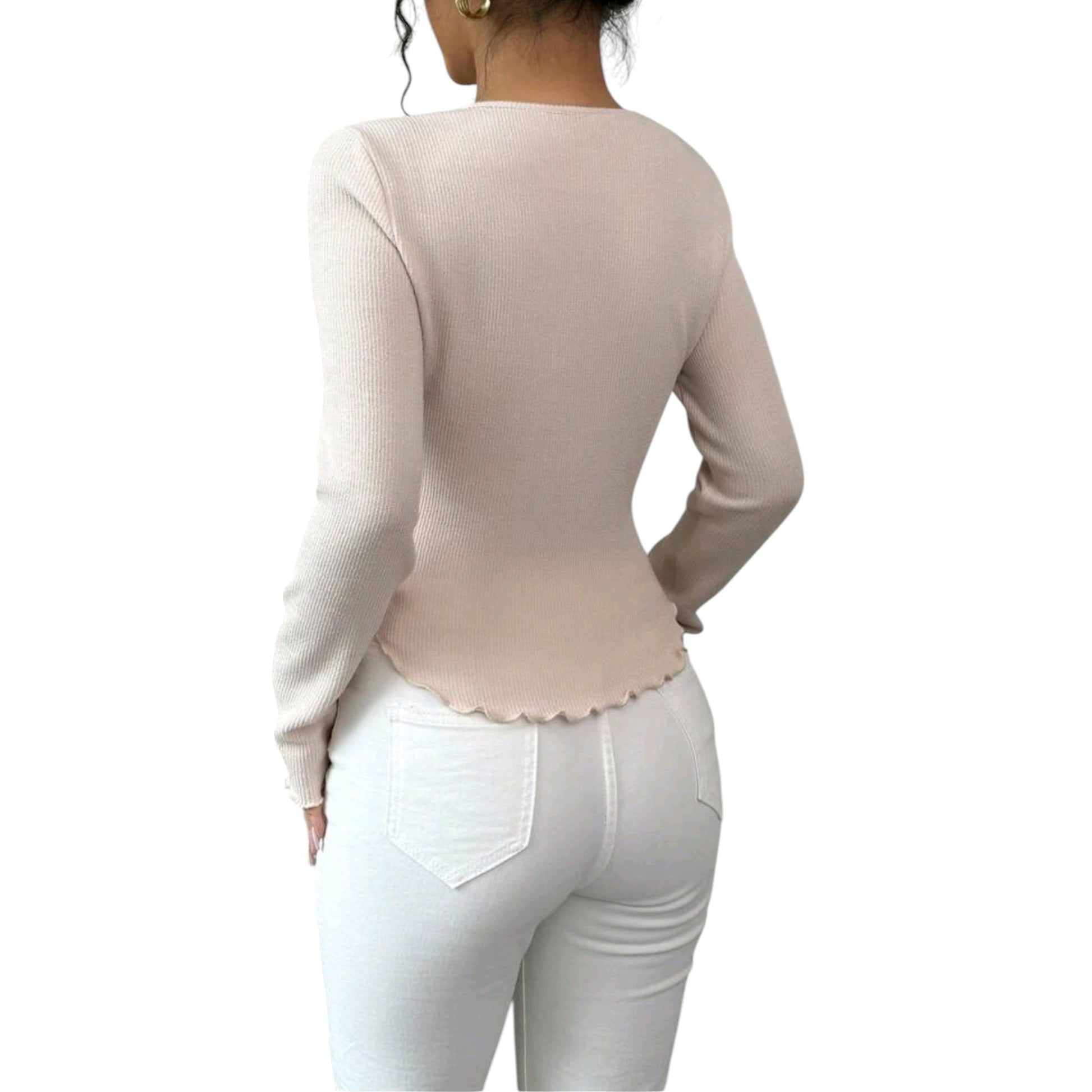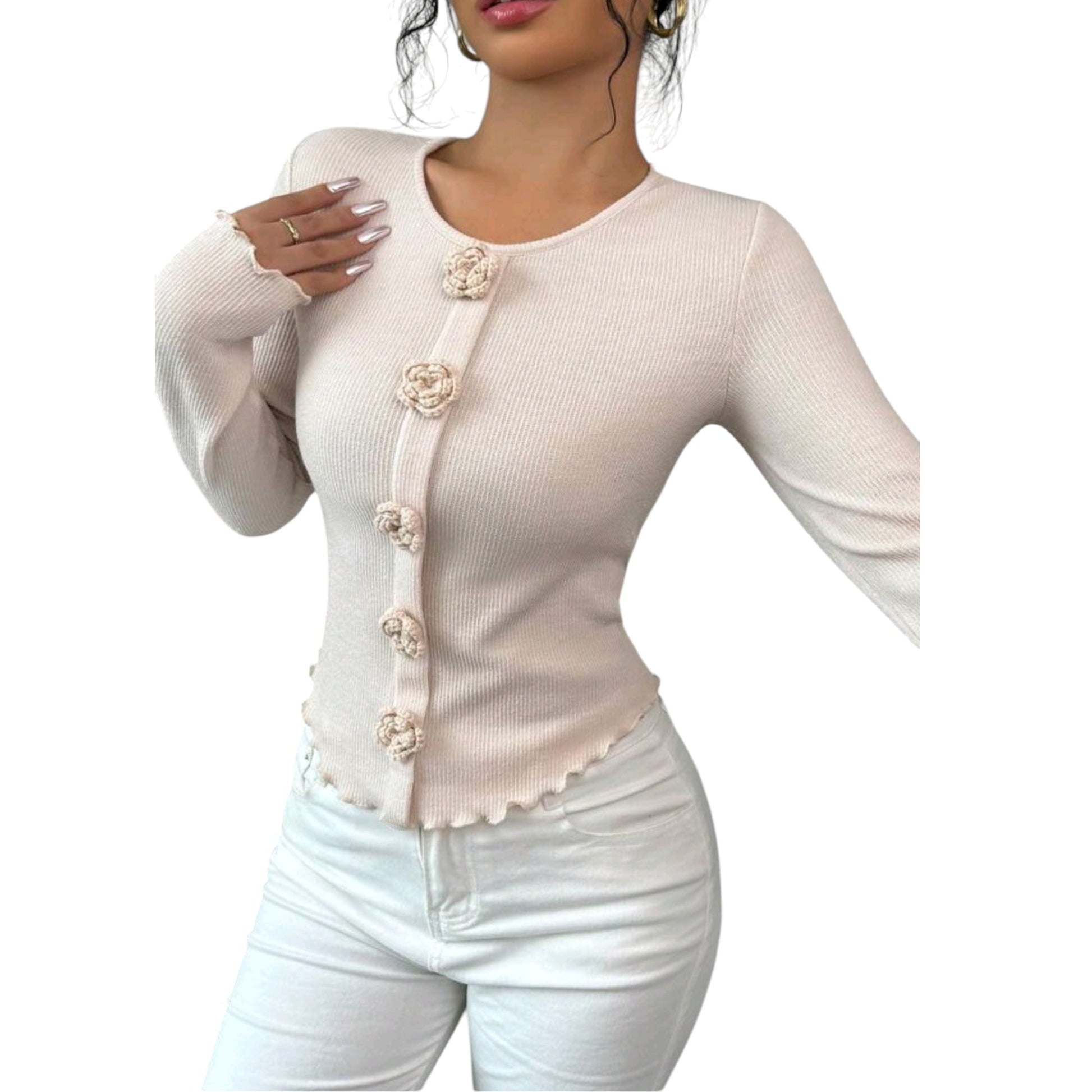 Címke nélküli, ekrü, kerek nyakú, hosszú ujjú, gombos felső virág alakú gombokkal és fodros szegéllyel.