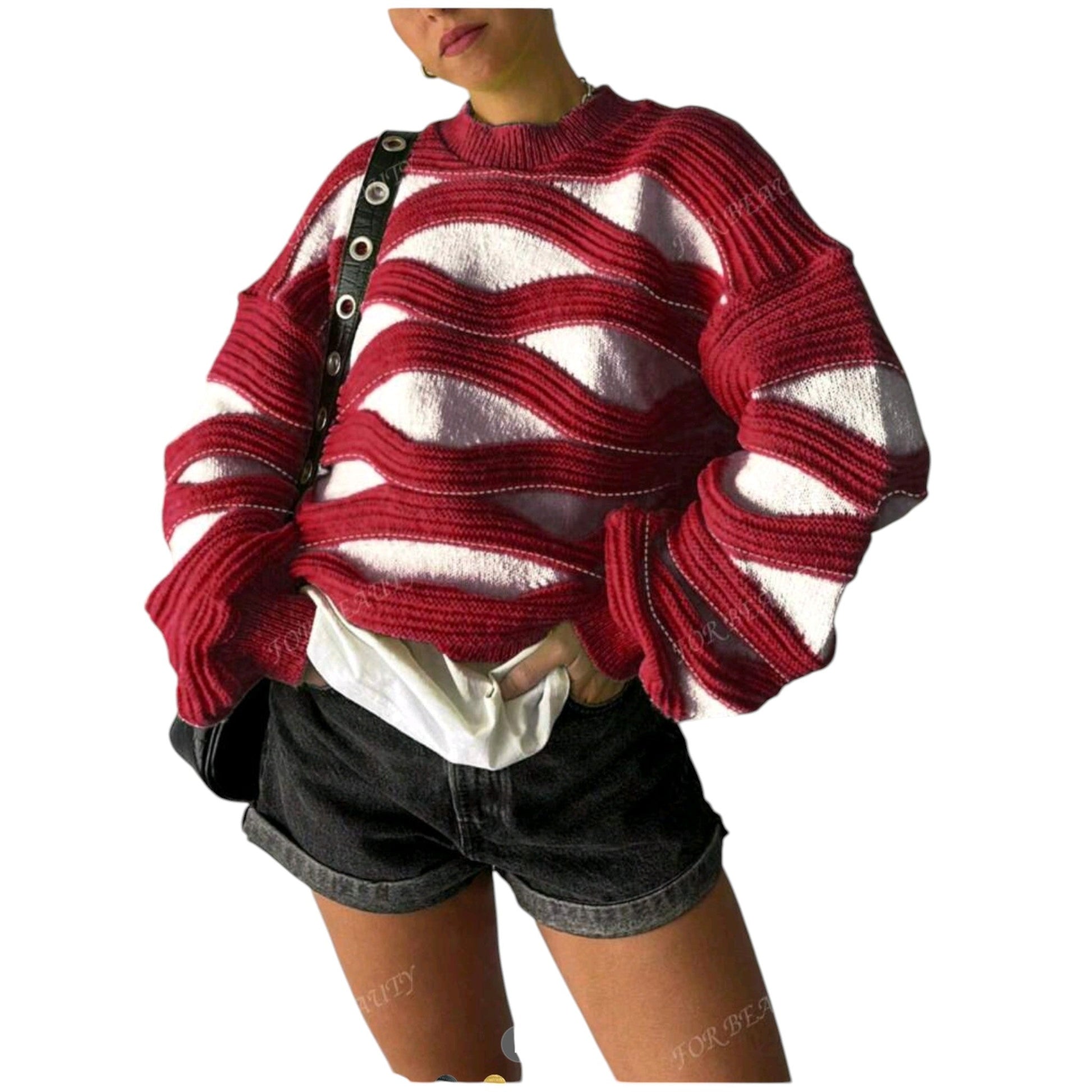 Címke nélküli, piros, csíkos, kötött, kerek nyakú, hosszú ujjú, oversize, hullámos mintázat