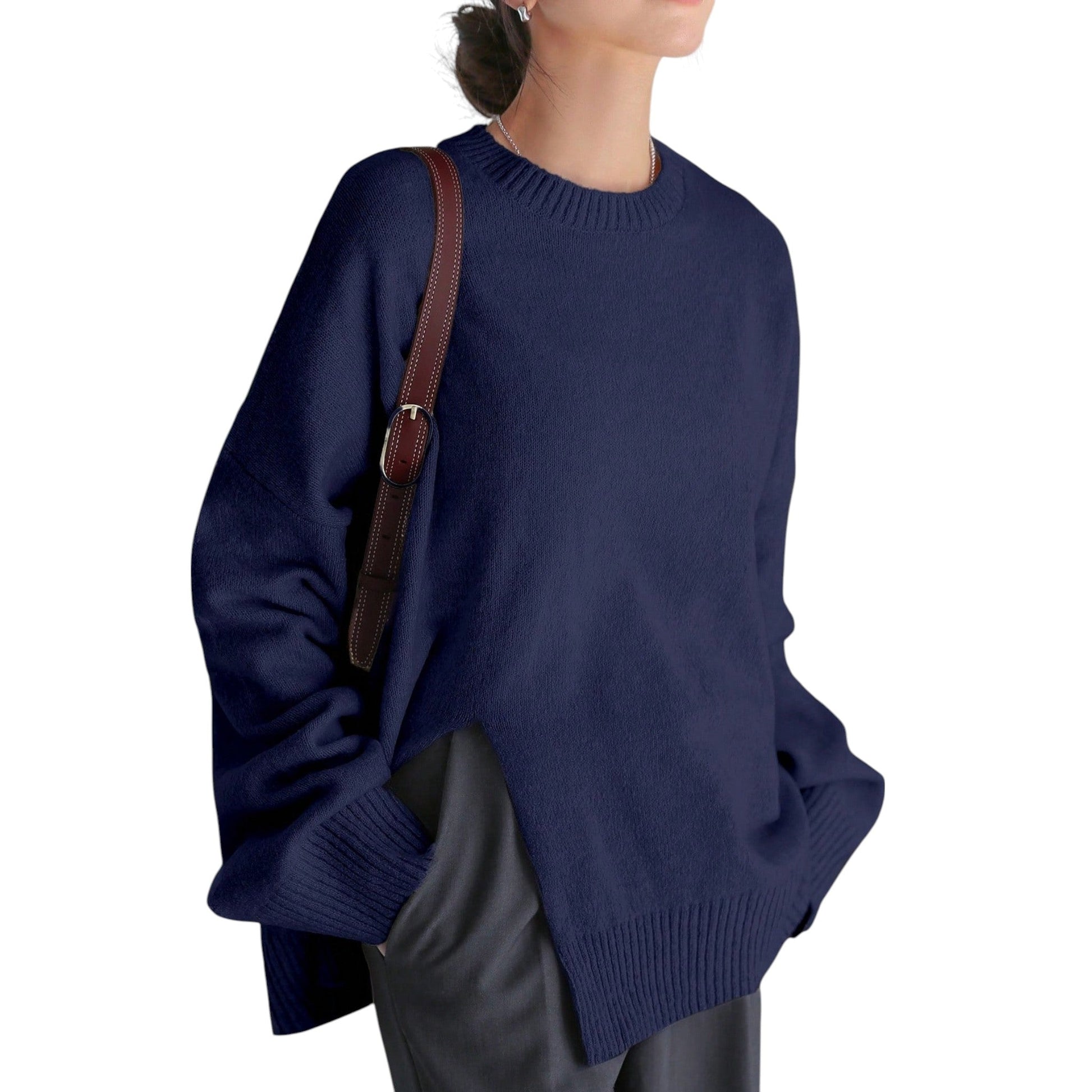 Címke nélküli, sötétkék, kötött, hosszú ujjú, kerek nyakú, oldalt felsliccelt pulóver.