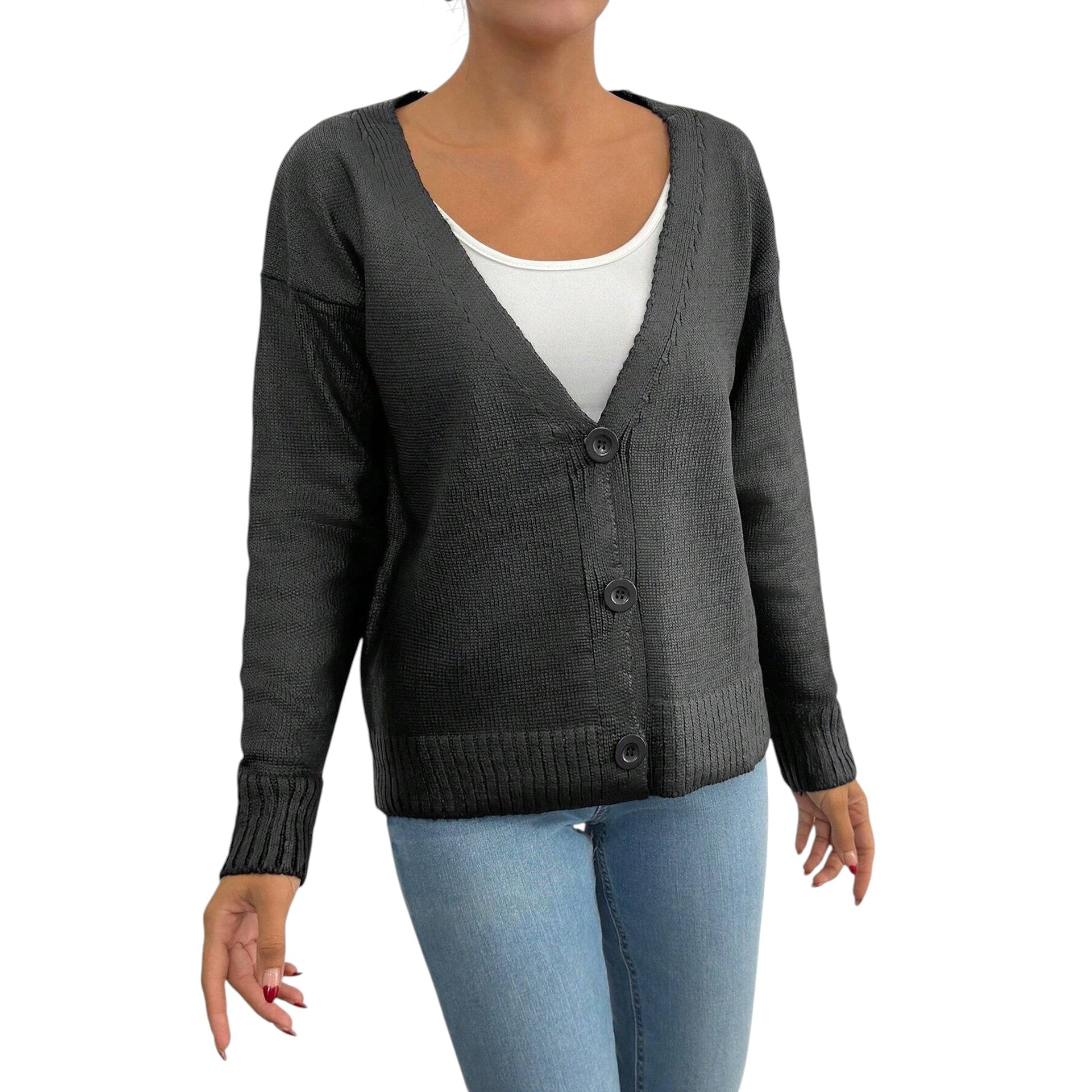 Címke nélküli, fekete, hosszú ujjú, V-nyakú, gombos kötött kardigán, bordázott passzéval.