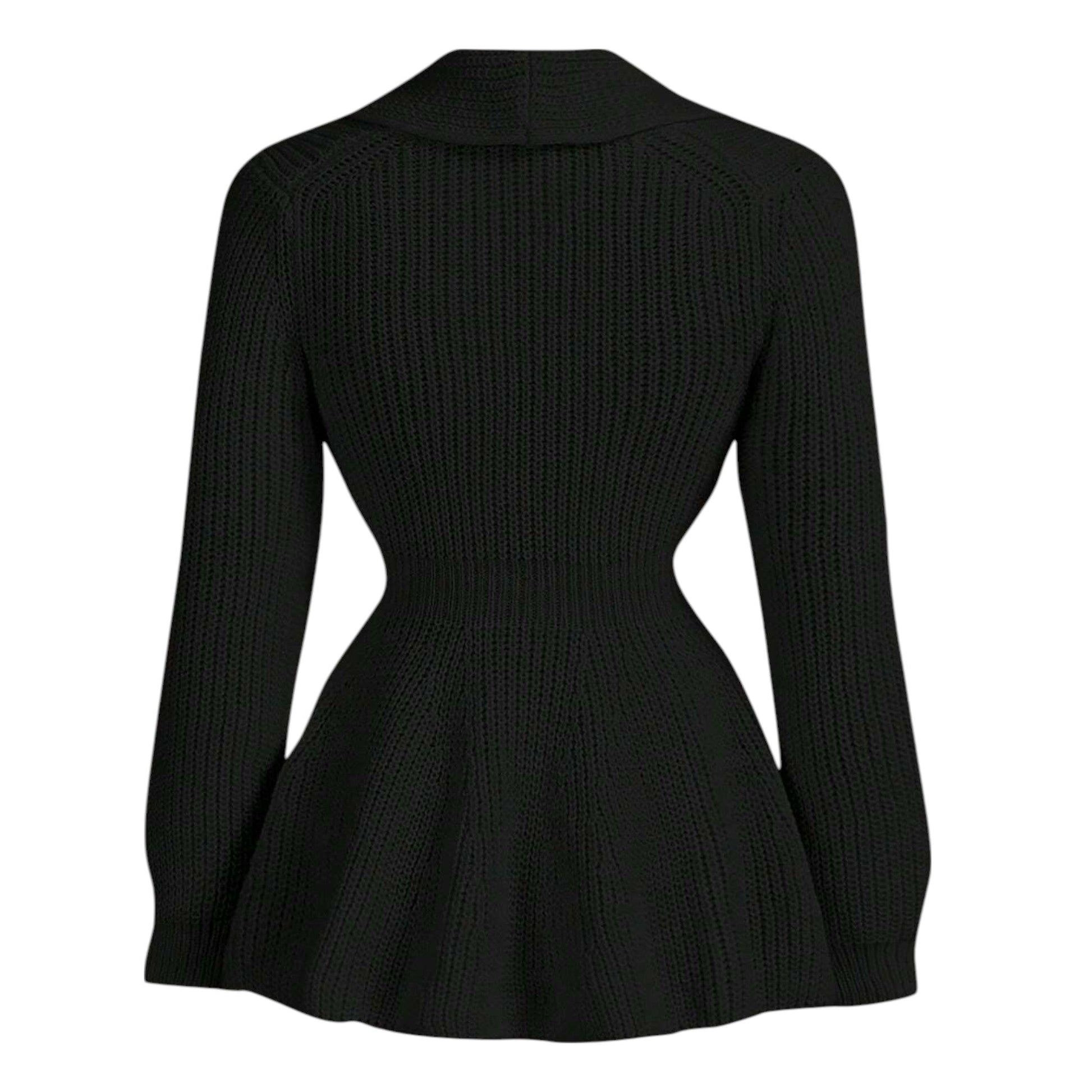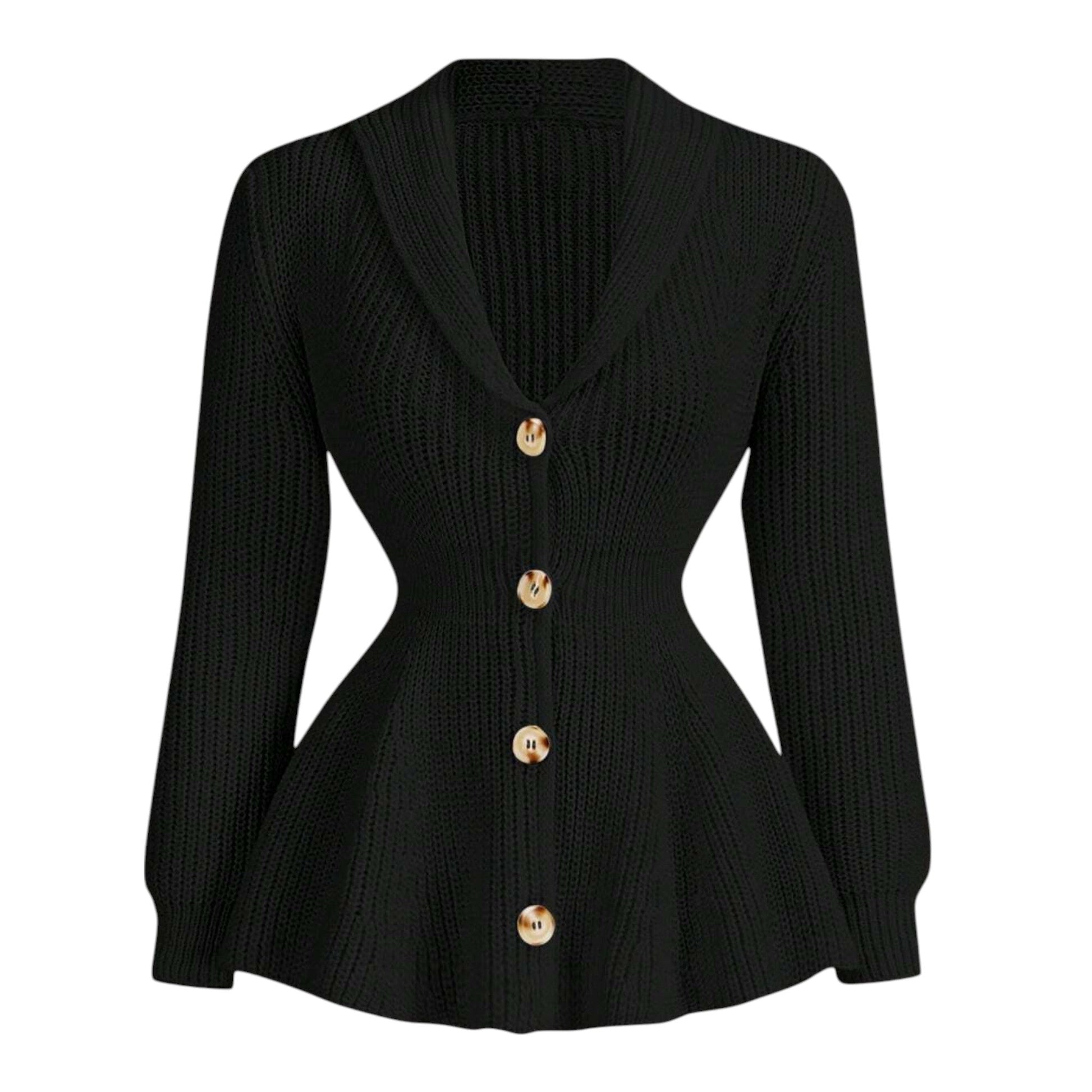 Címke nélküli, fekete, hosszú ujjú, galléros, gombos, kötött, peplum fazonú kardigán.