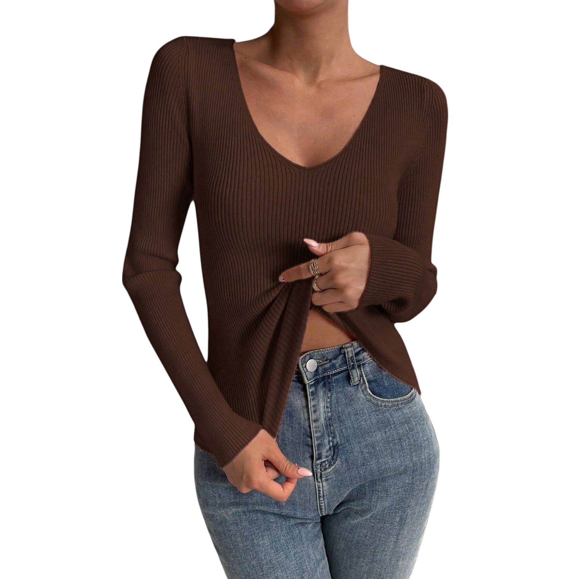 SHE barna V-nyakú bordás pulóver