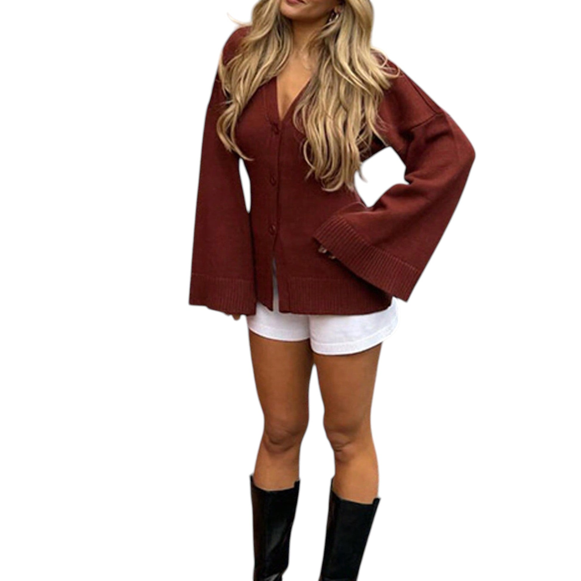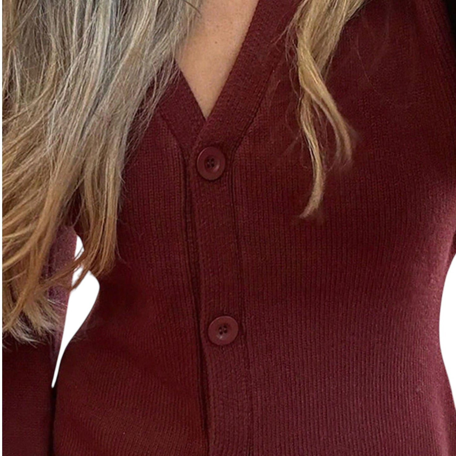 Címke nélküli, bordó, V-nyakú, gombos, bő, harangujjú, kötött.