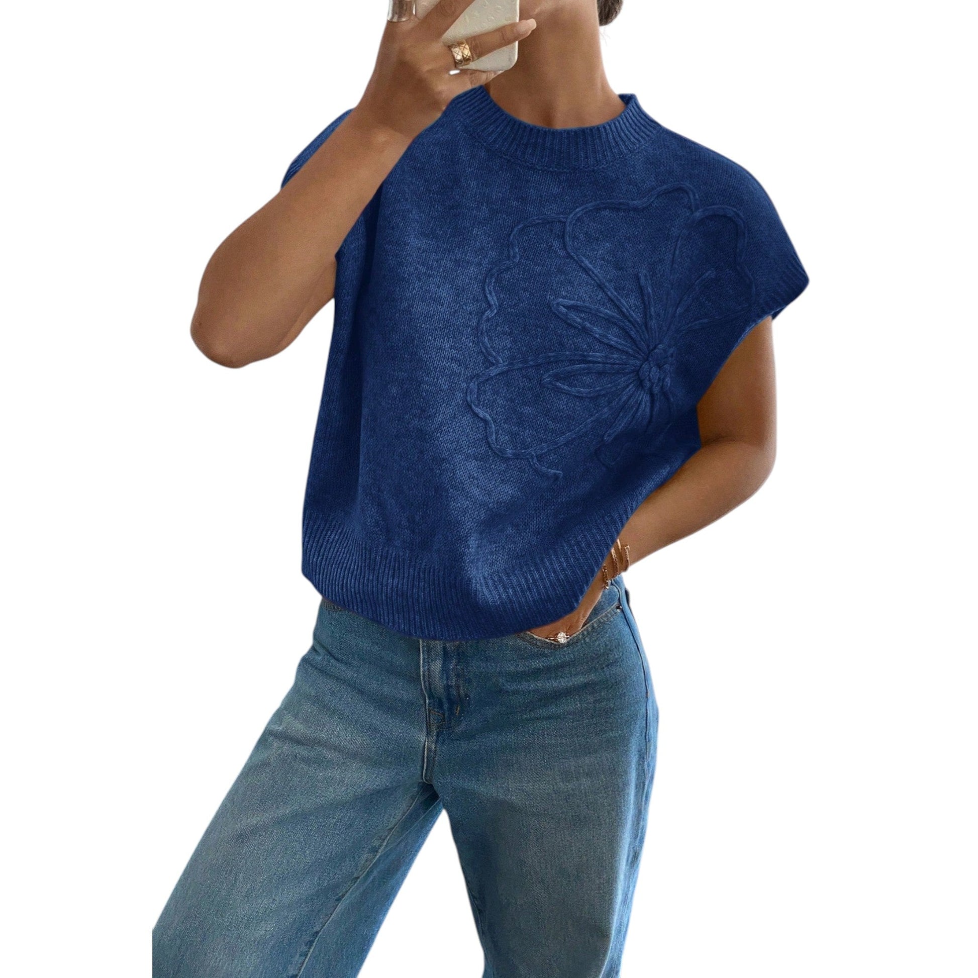 Címke nélküli, kék, kerek nyakú, ujjatlan, elől hímzett virág mintával, kötött.
