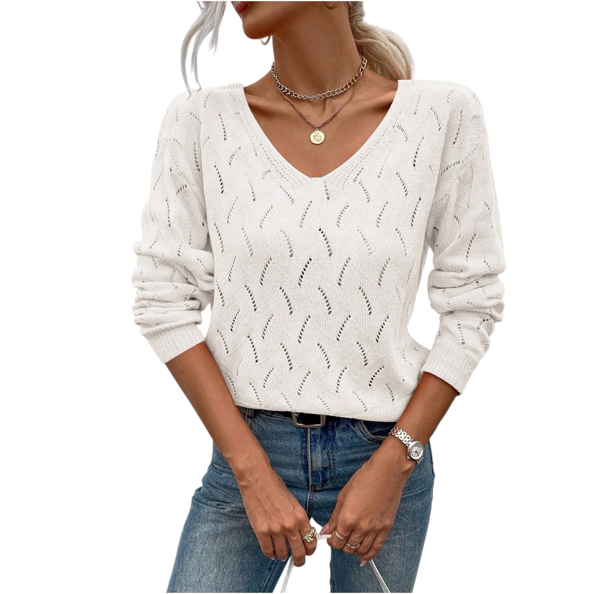 SHE ekrü V-nyakú lyukacsos kötött pulóver