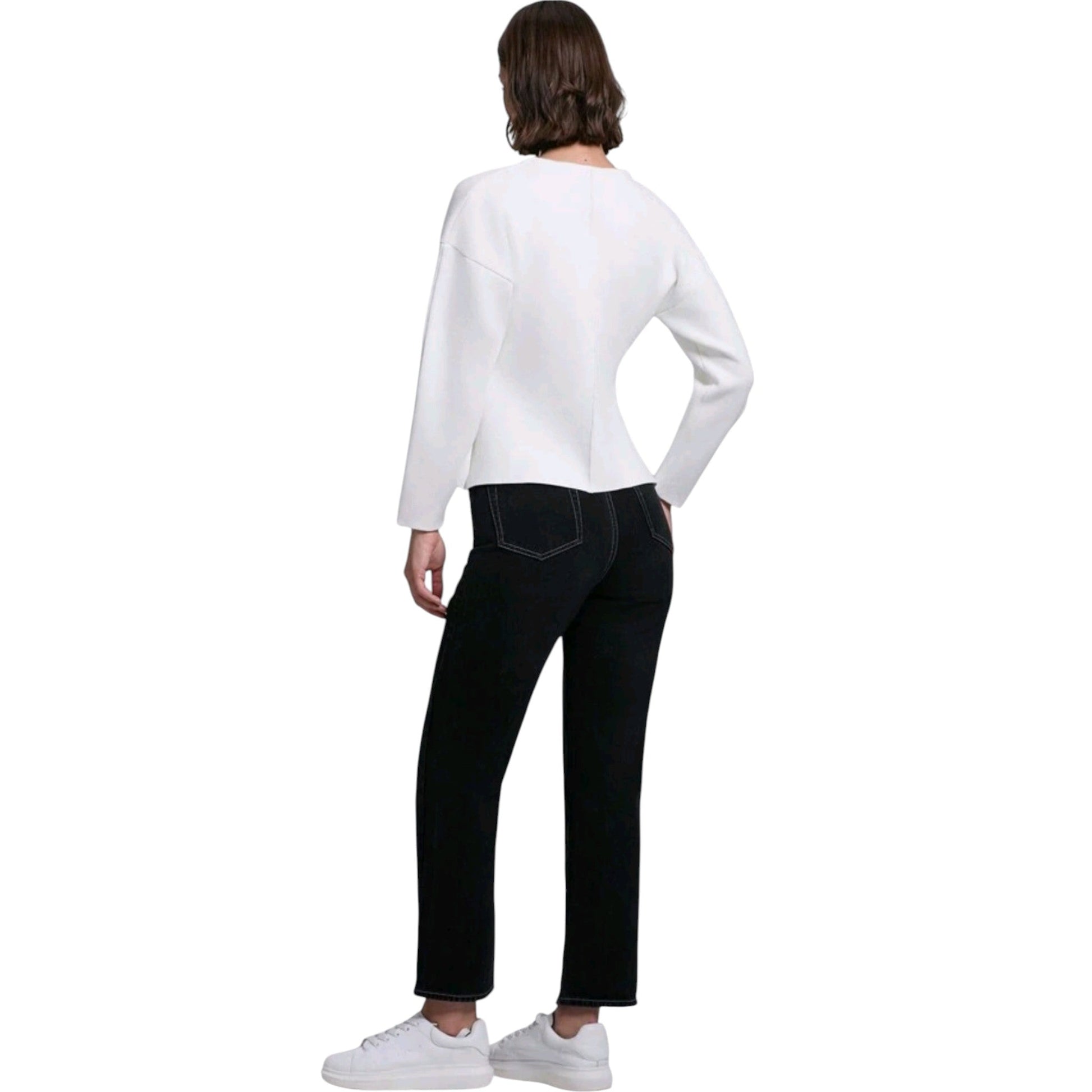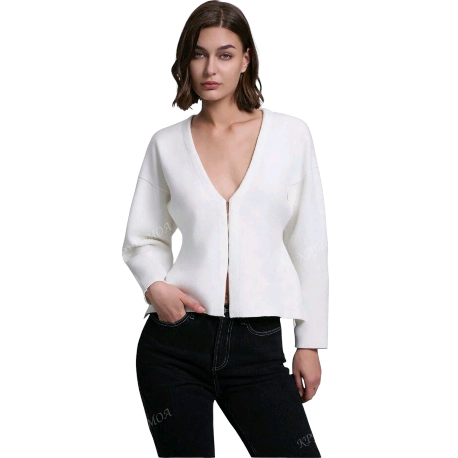 Címke nélküli, fehér, kötött, V-nyakú, hosszú, bővülő ujjú.