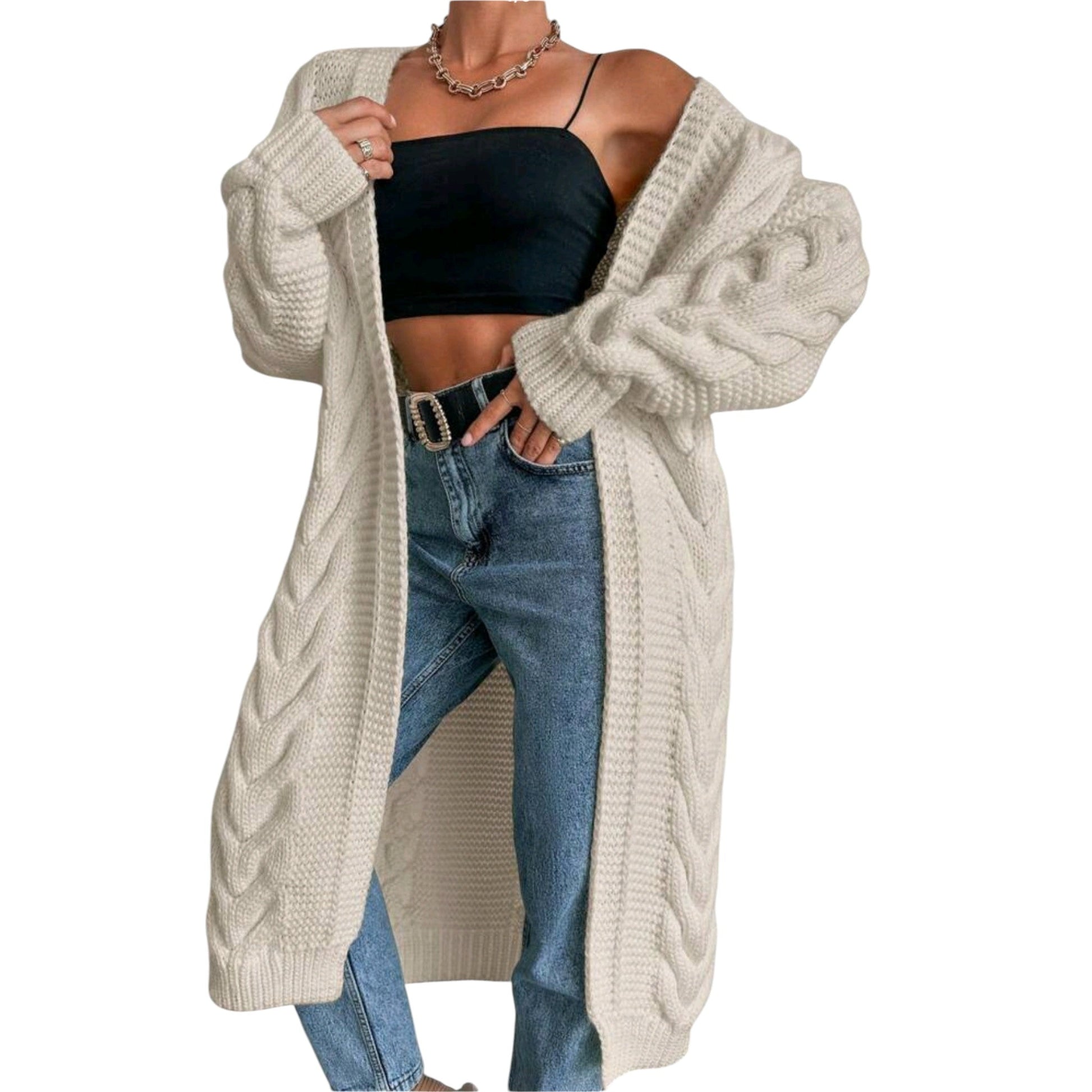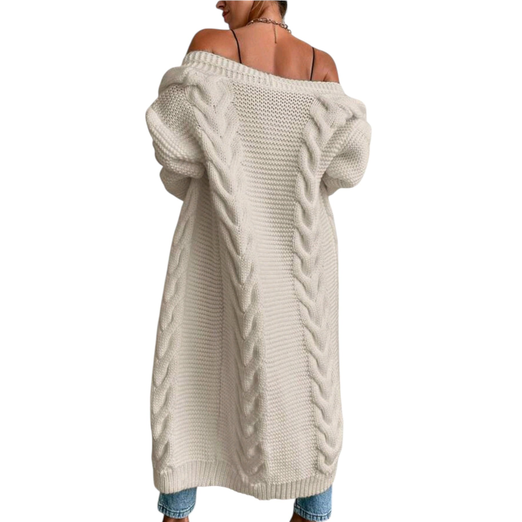 Címke nélküli, ekrü, kötött, hosszú, nyitott, hosszú ujjú, kábelkötéses minta.