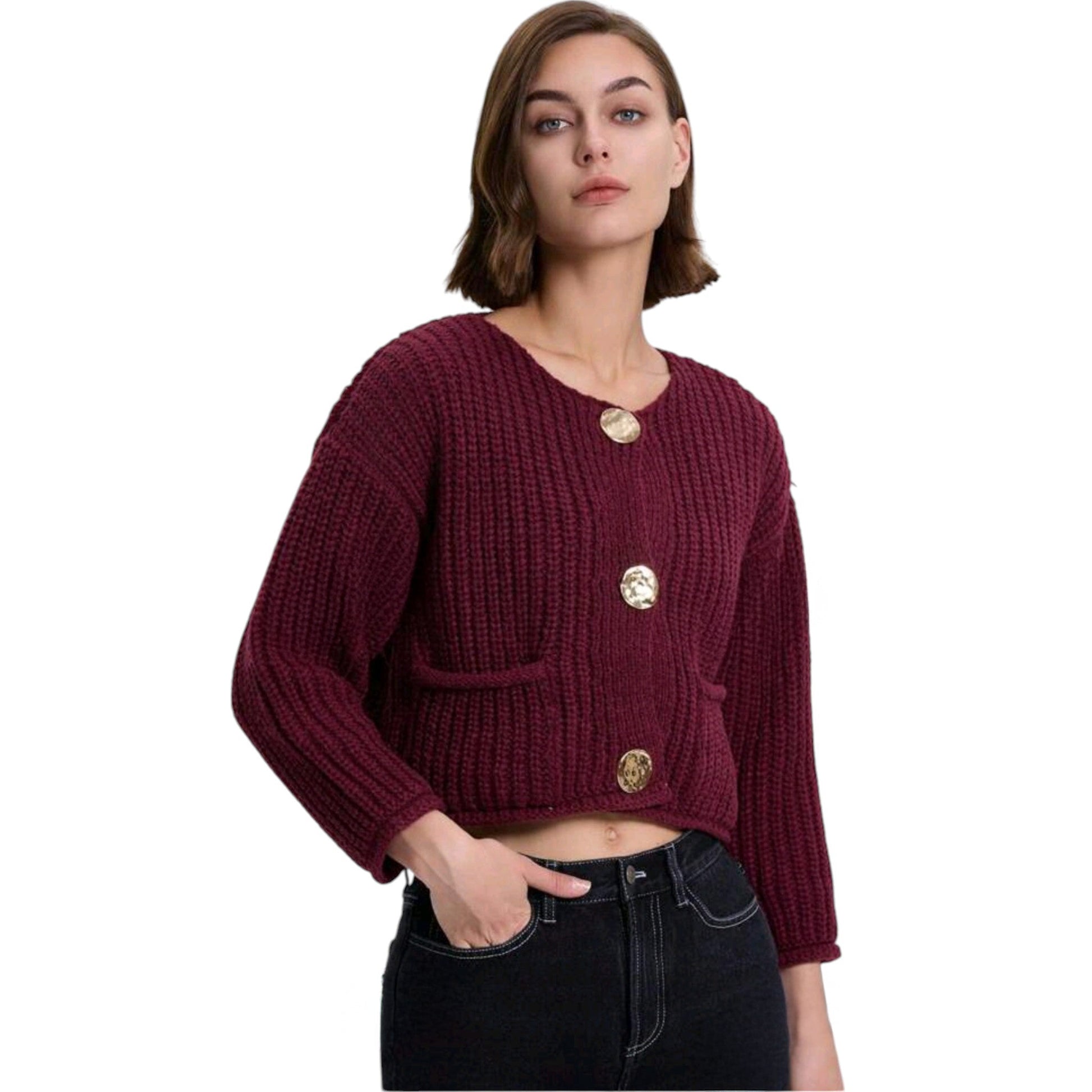 Címke nélküli, bordó, kötött, kerek nyakú, gombos, hosszú ujjú, rövid szabású.