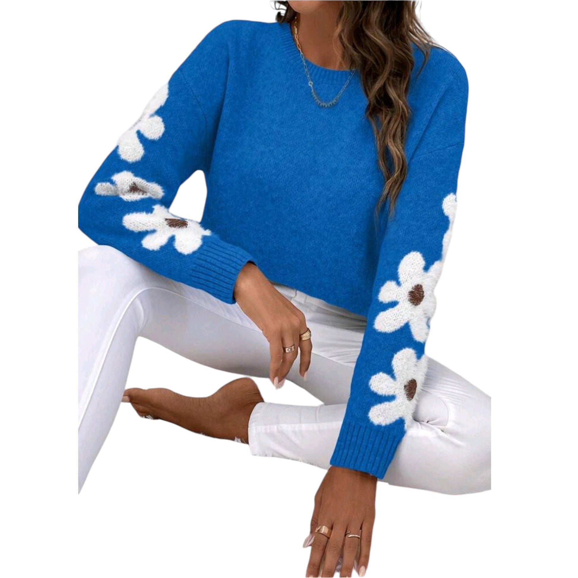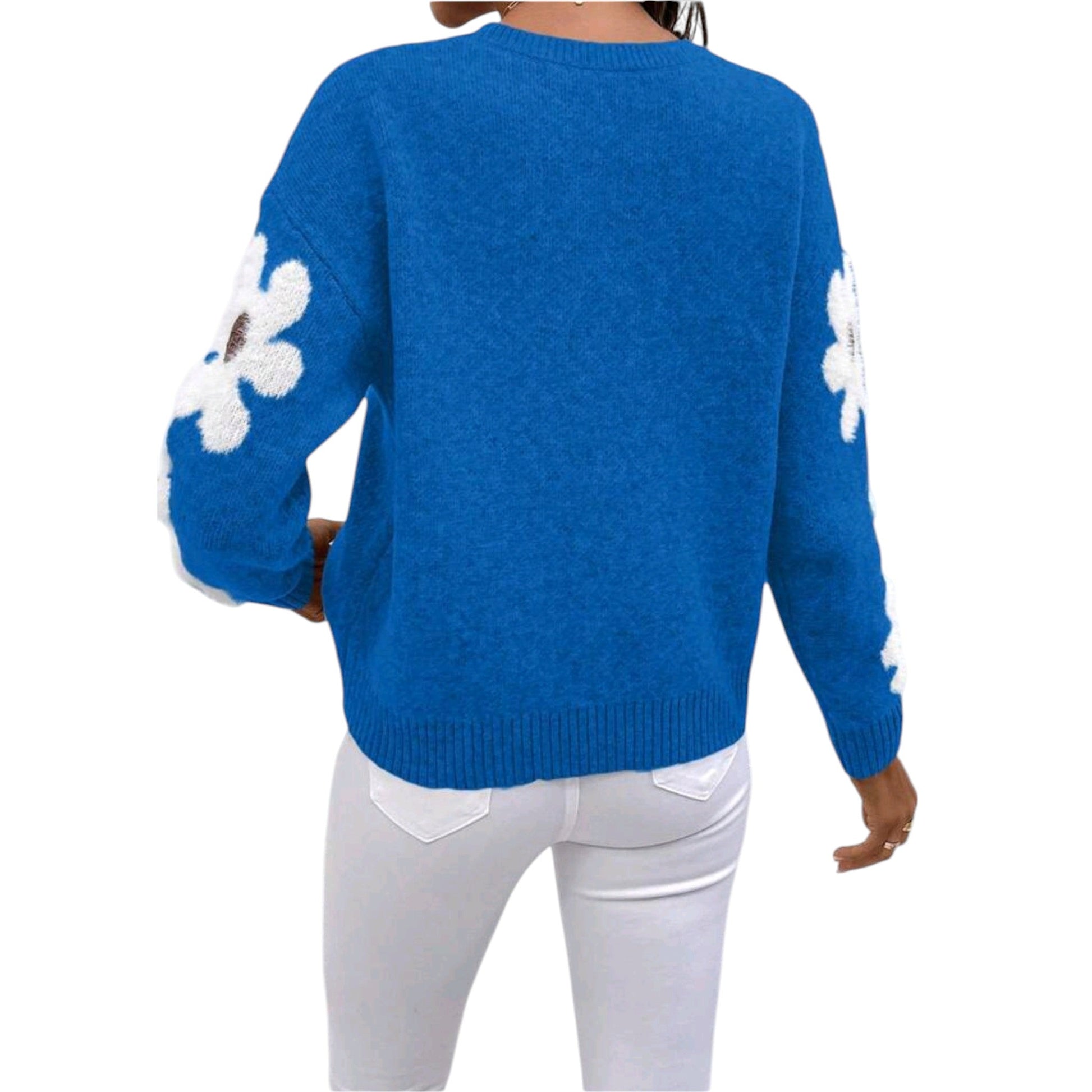Címke nélküli, kék, kötött, kerek nyakú, hosszú ujjú, fehér virágmintával.