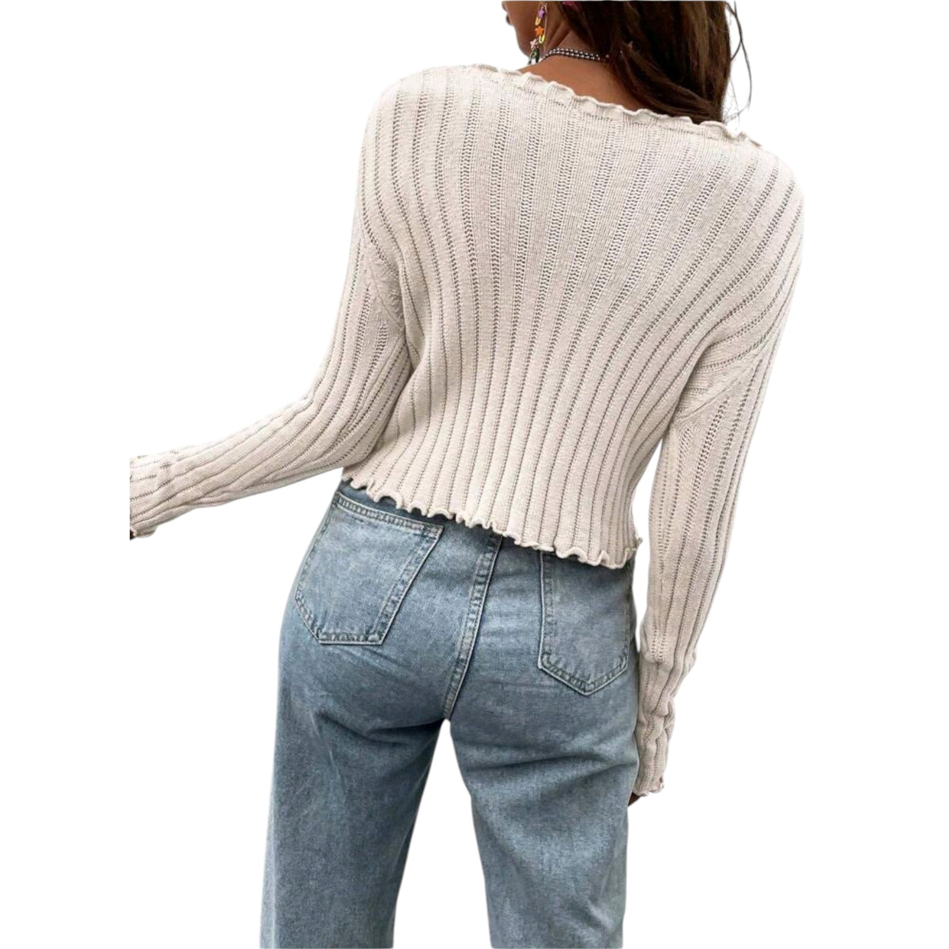 Címke nélküli, krém, kötött, rövid, megkötős, hosszú ujjú, fodros szélű.