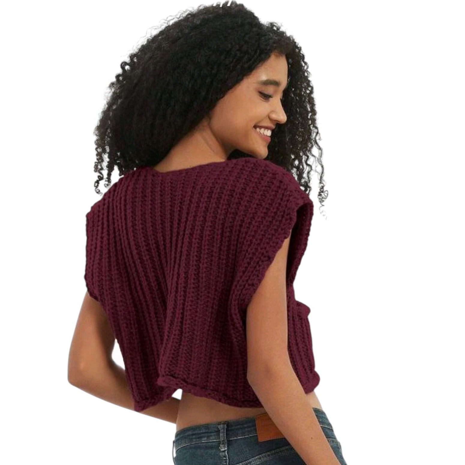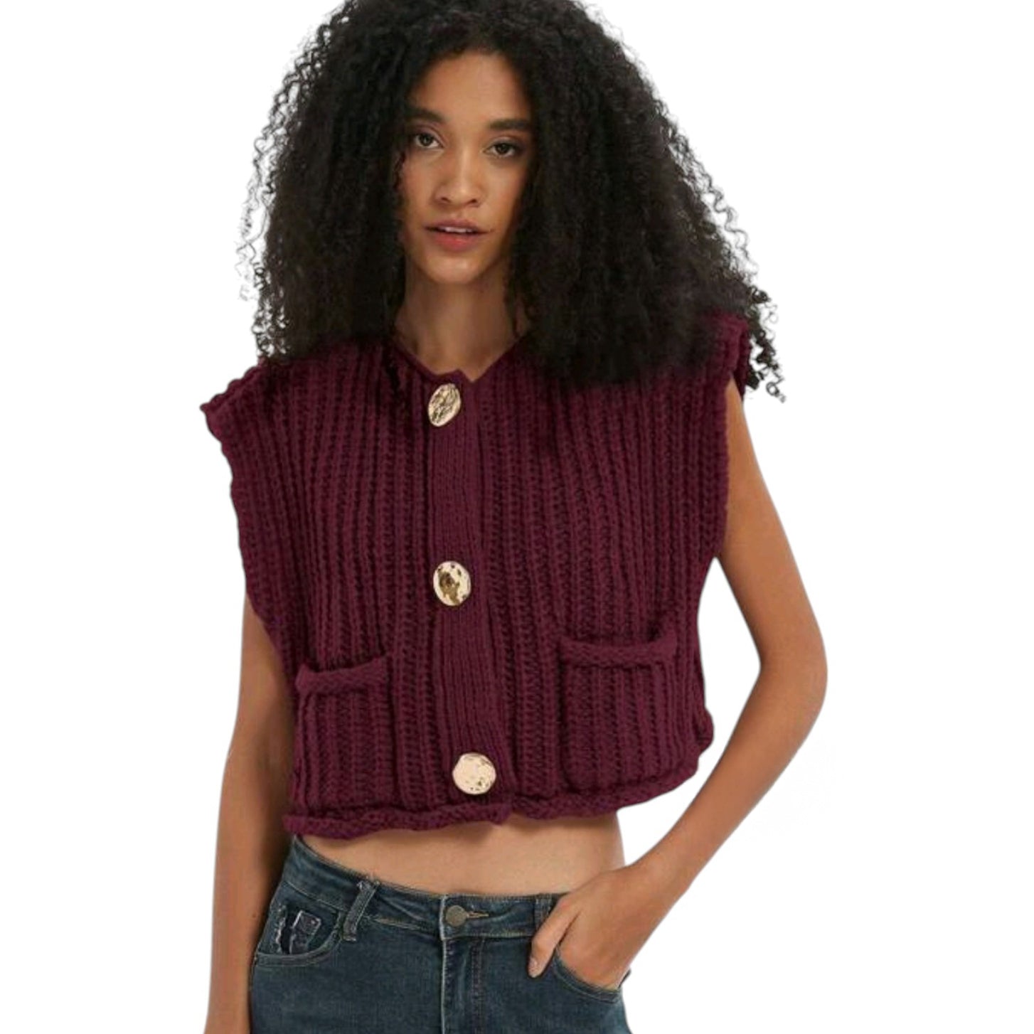 Címke nélküli, bordó, kötött, ujjatlan, gombos, zsebes, rövid.