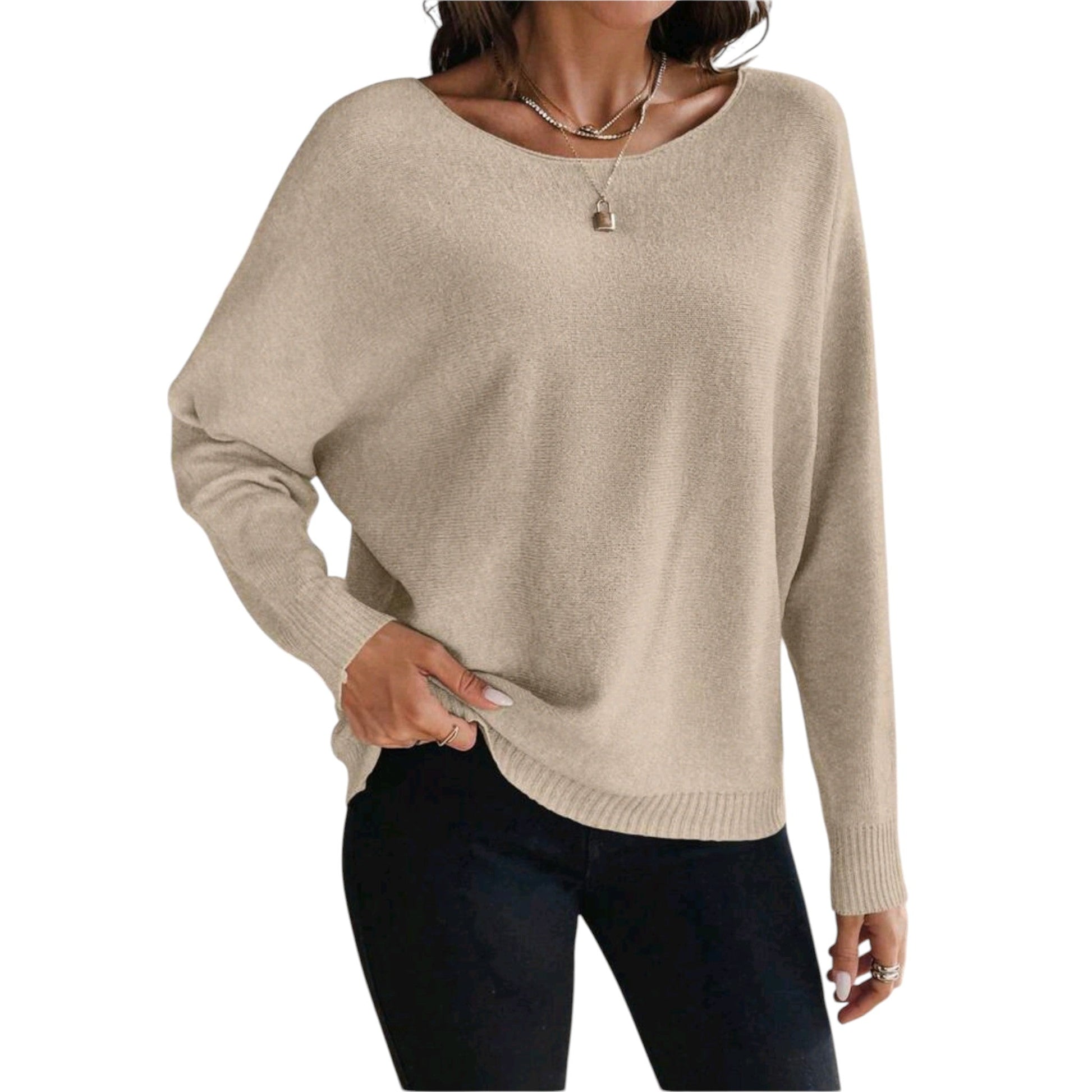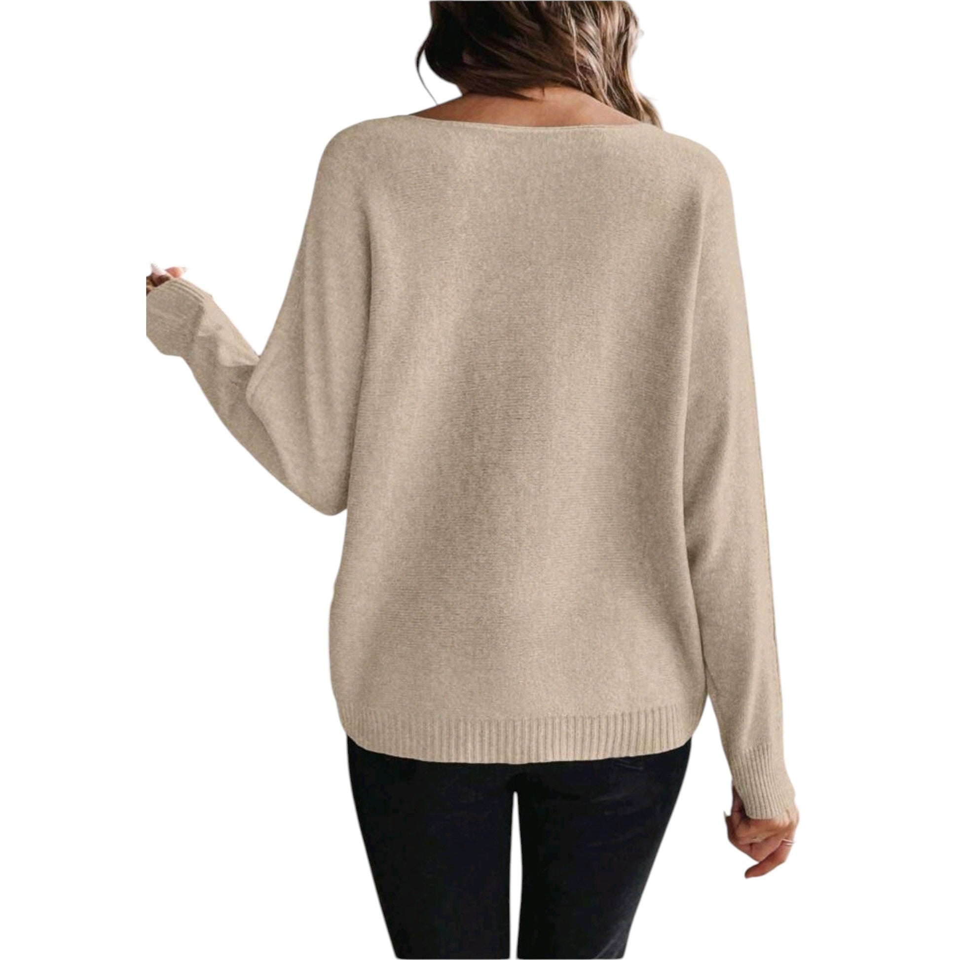 Címke nélküli, bézs, kötött, hosszú ujjú, csónaknyakú, bordázott passzéval.