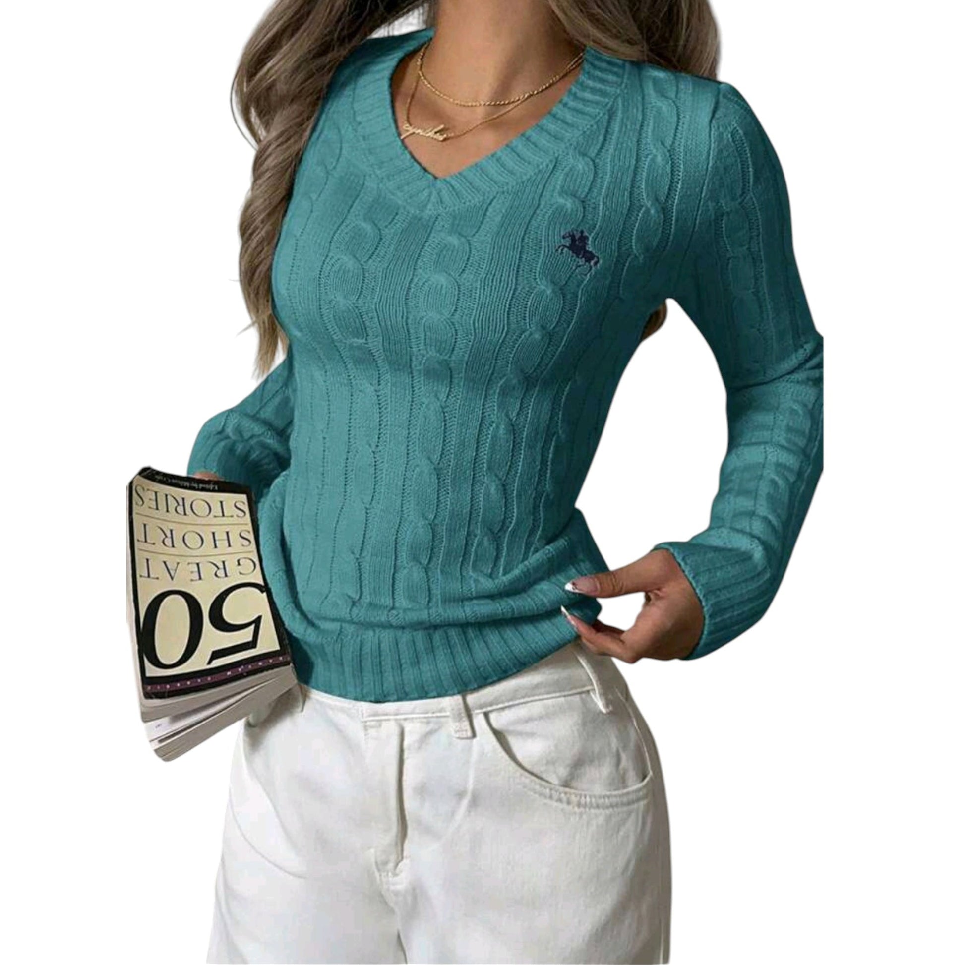 Címke nélküli, türkiz, kötött, V-nyakú, hosszú ujjú, slim fit, kábelkötés mintával.