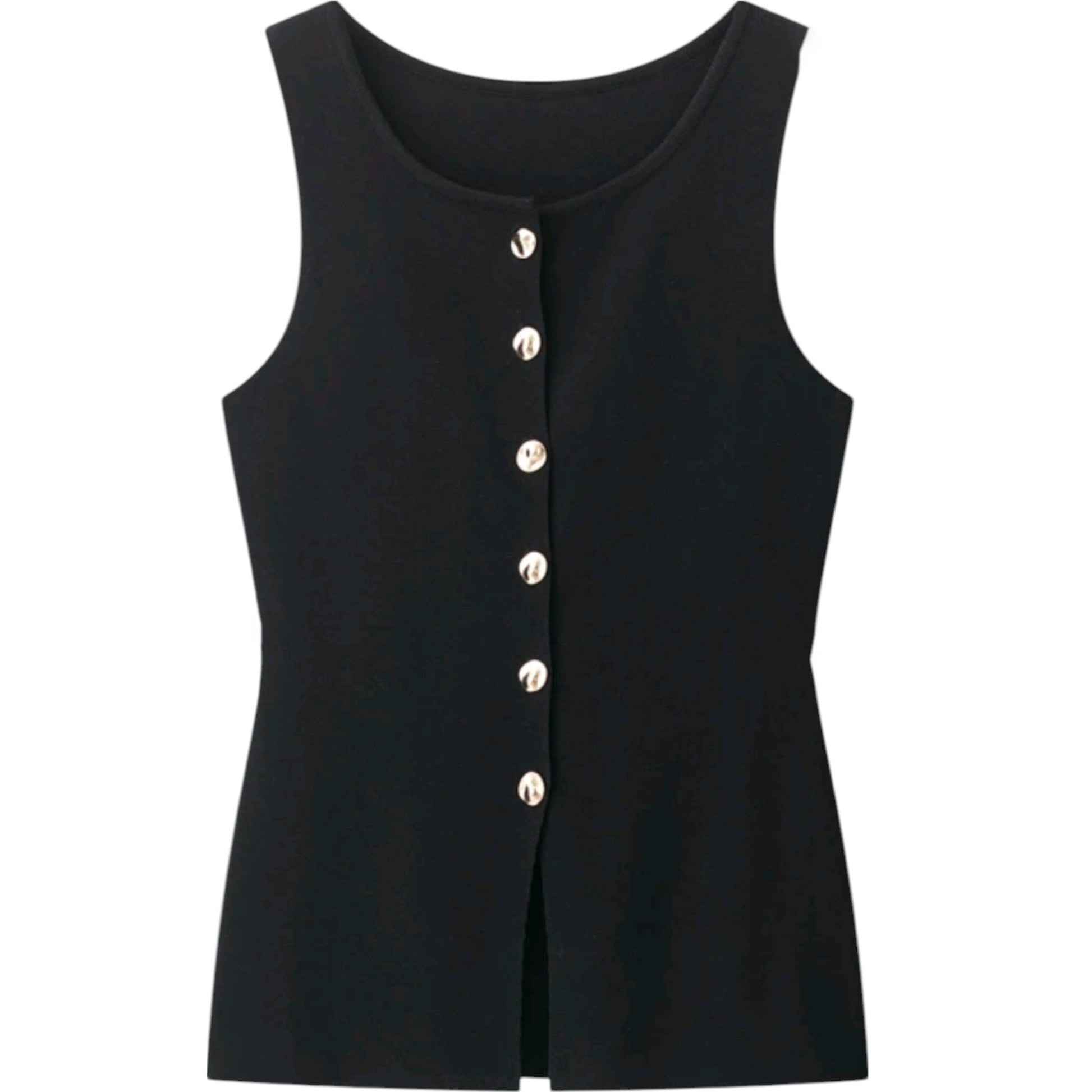 Címke nélküli, fekete, ujjatlan, kerek nyakú, elöl gombos.
