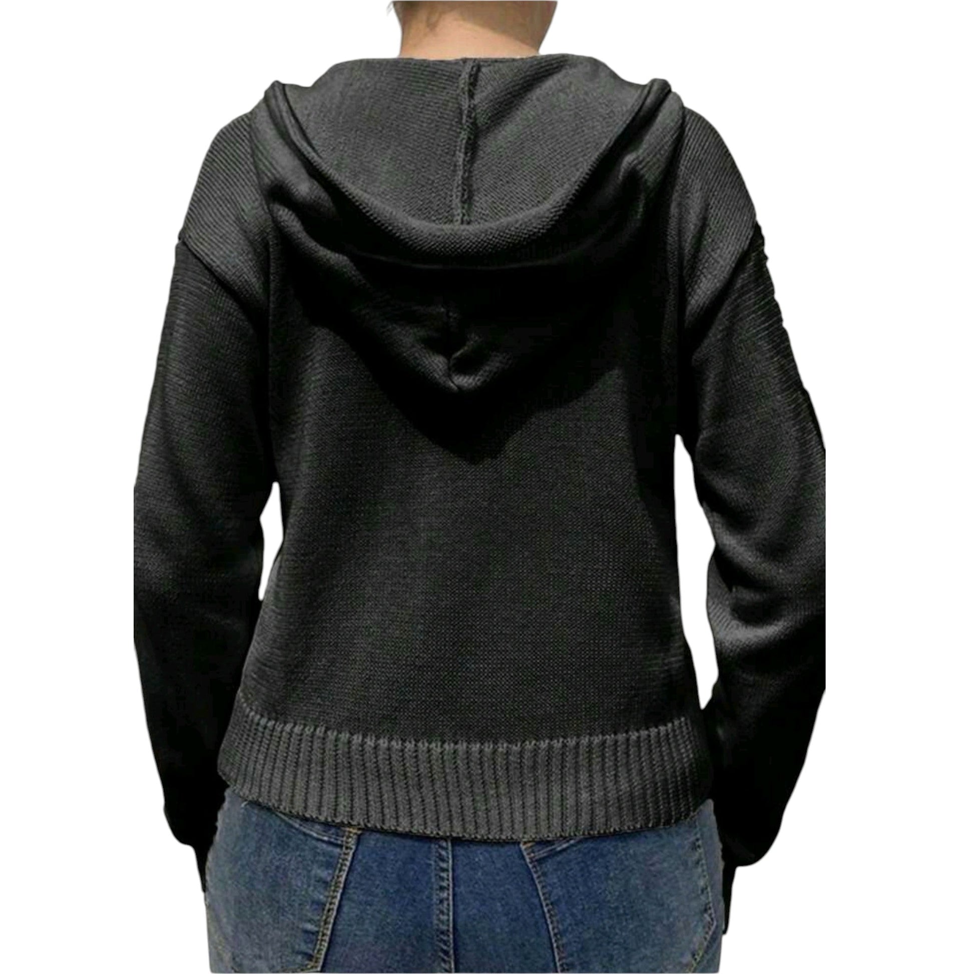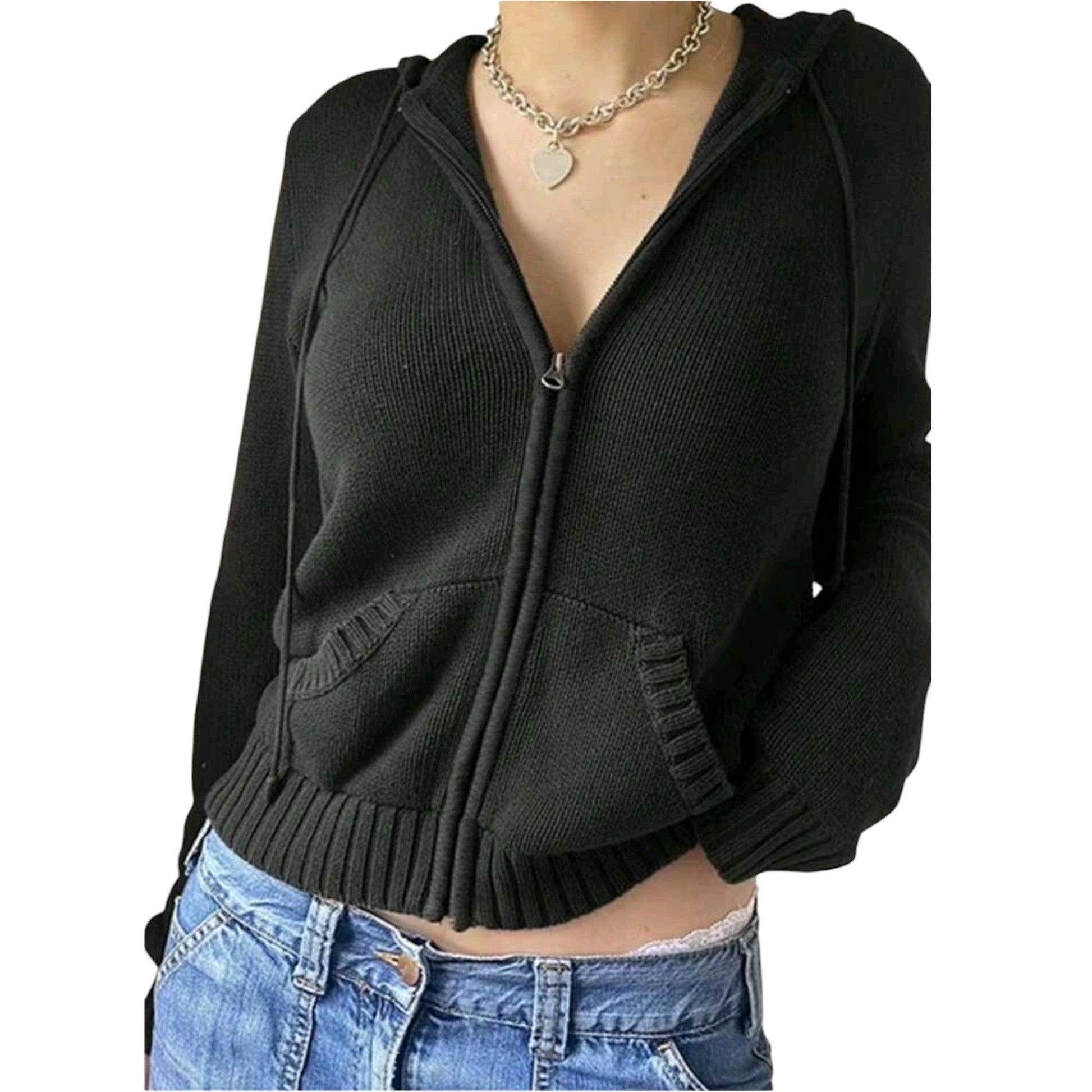 Címke nélküli, fekete, rövid, cipzáras, kapucnis, hosszú ujjú, zsebes, bordázott passzéval.
