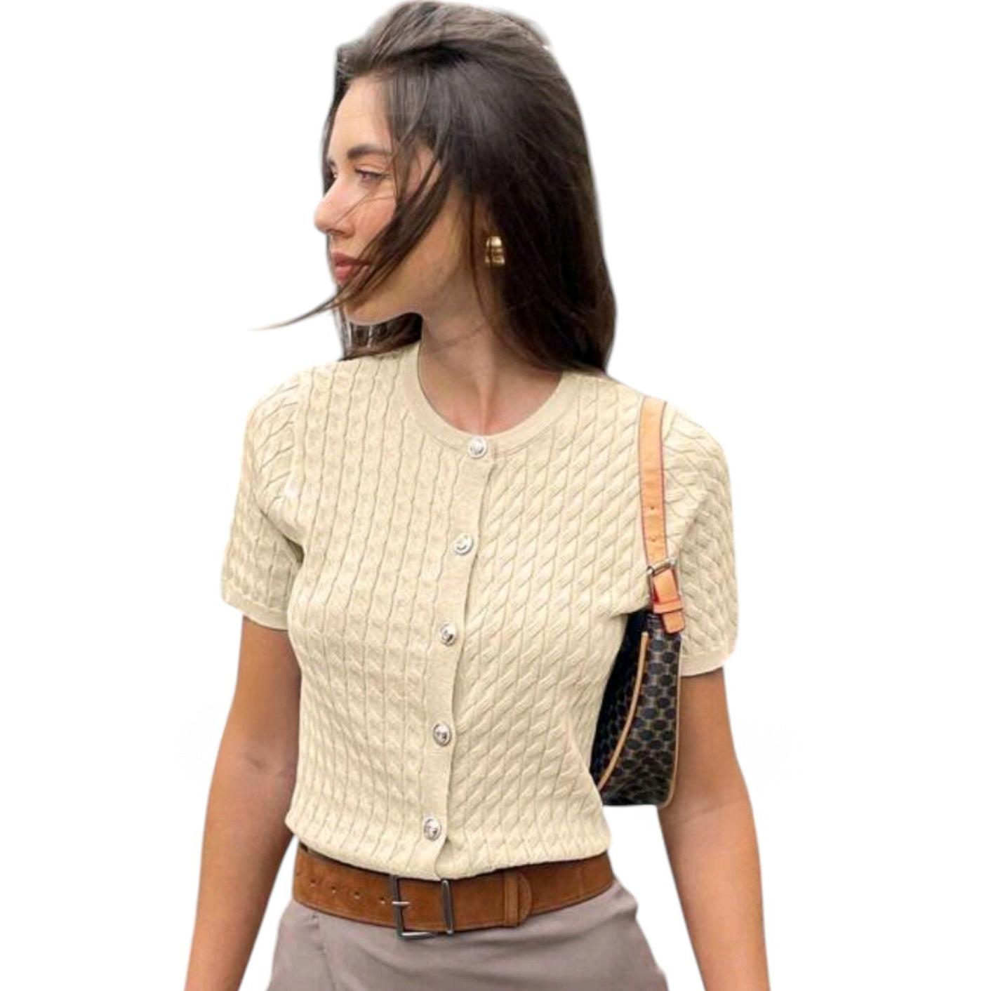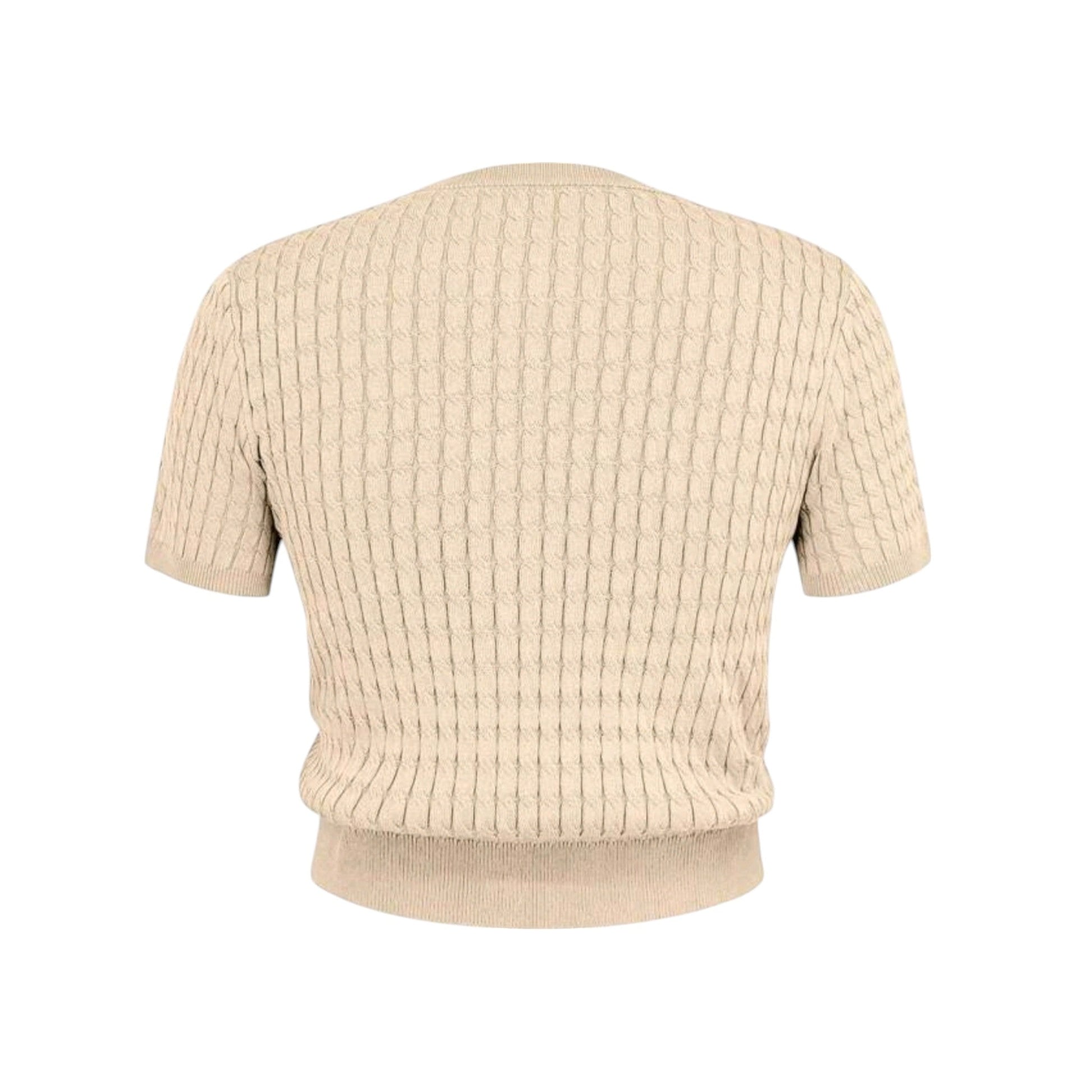 Címke nélküli, bézs, kötött, rövid ujjú, gombos, kerek nyakú, kábelkötés mintával.