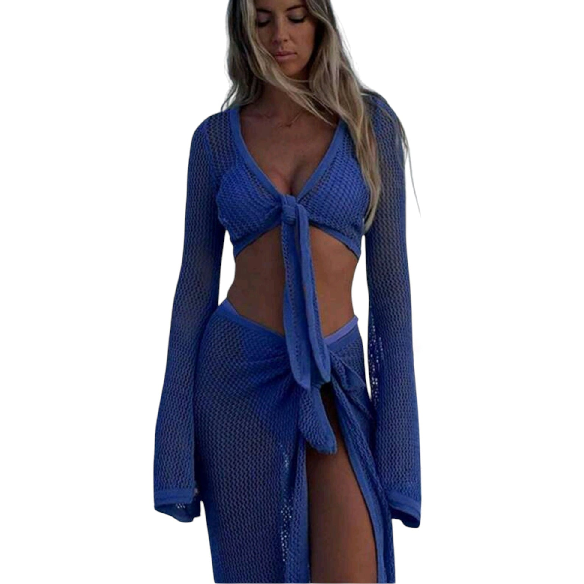 Címke nélküli, kék, horgolt hatású, hosszú harangujjú crop top.