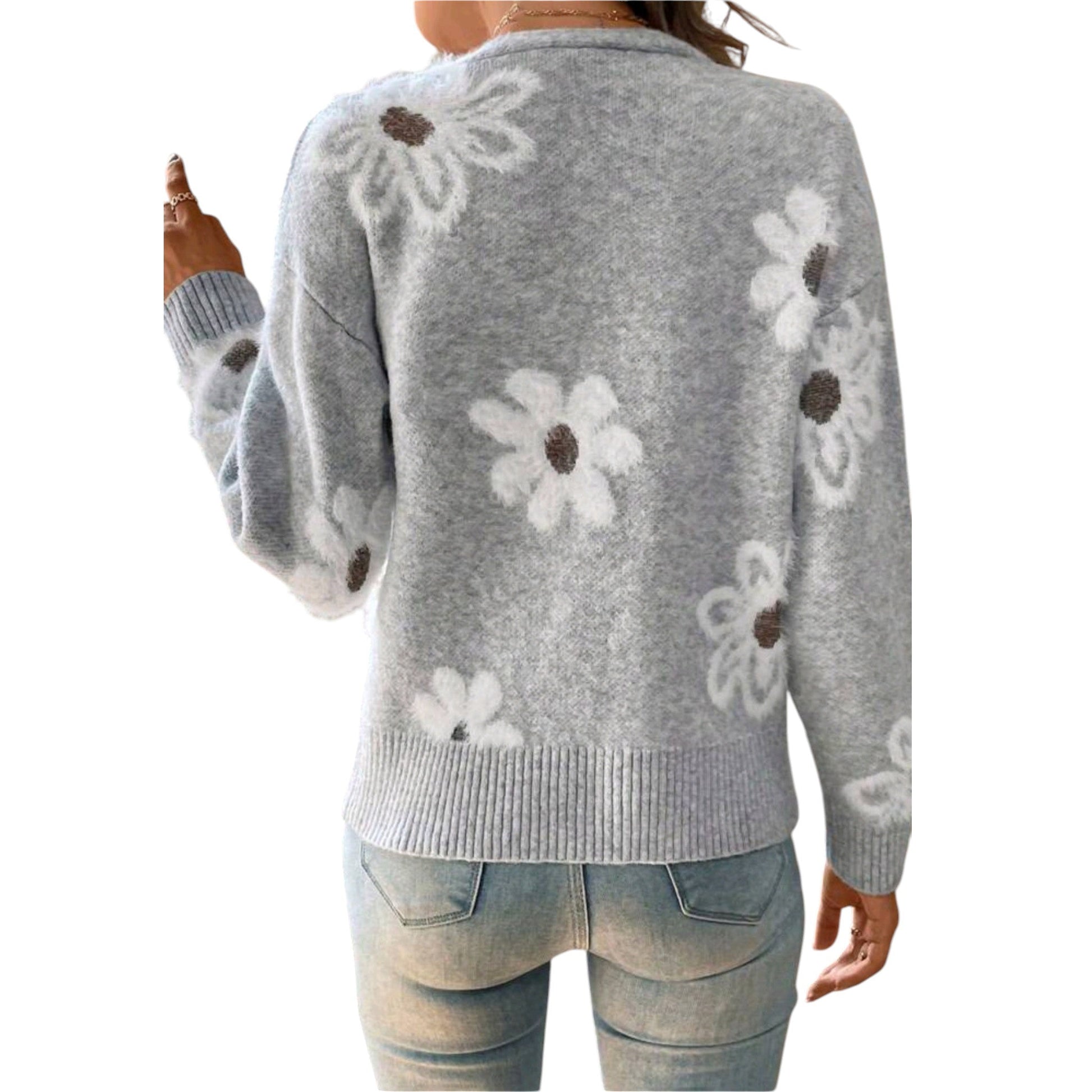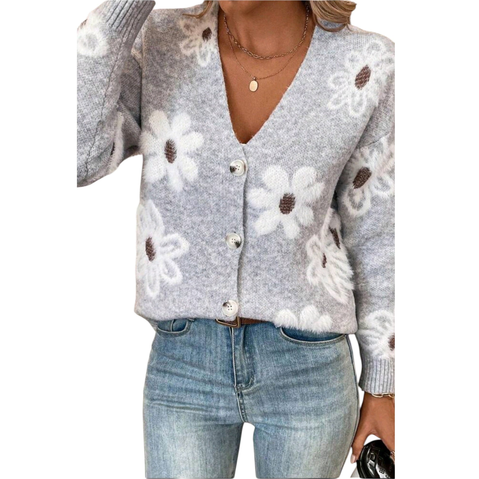 Címke nélküli, szürke, virágmintás, V-nyakú, gombos, hosszú ujjú.