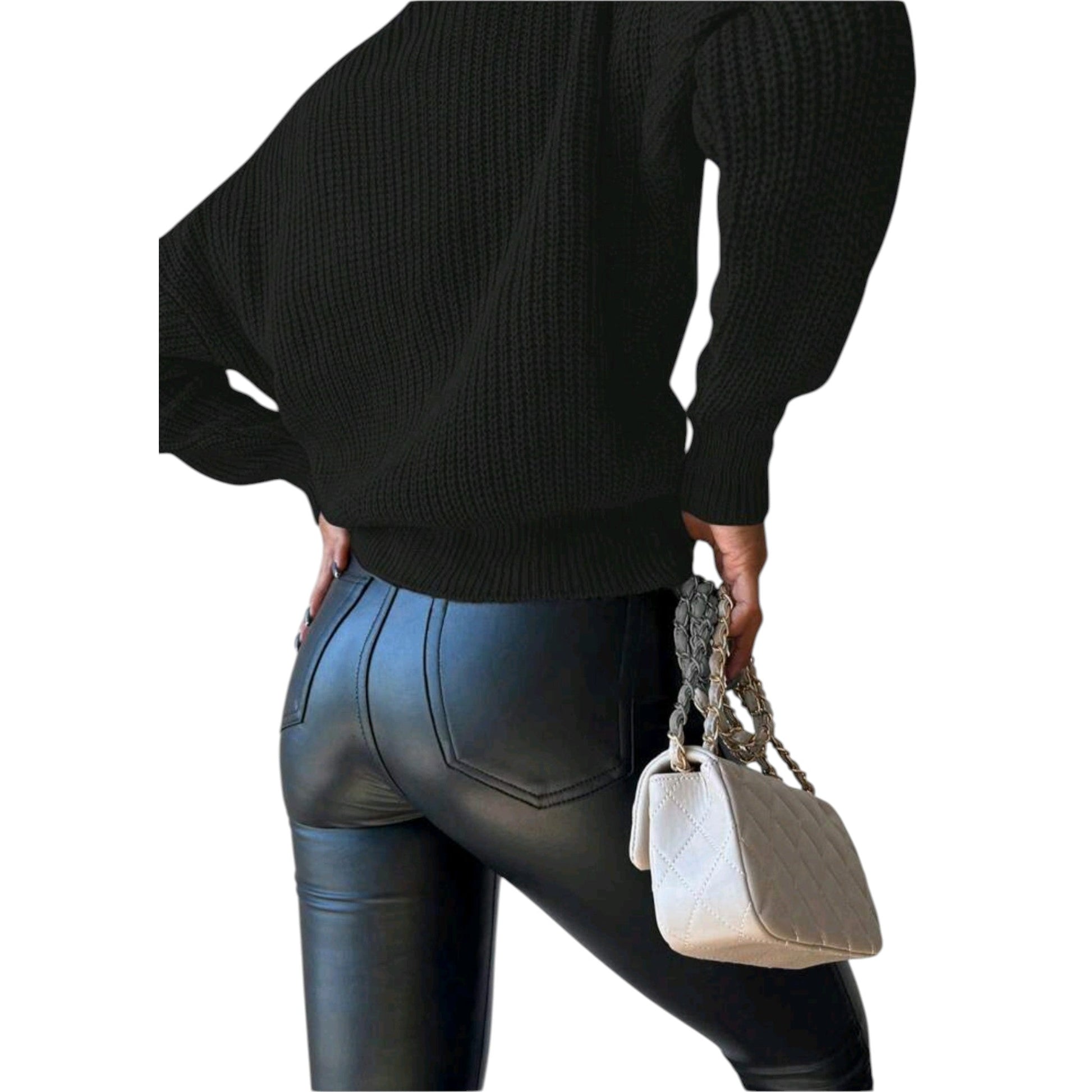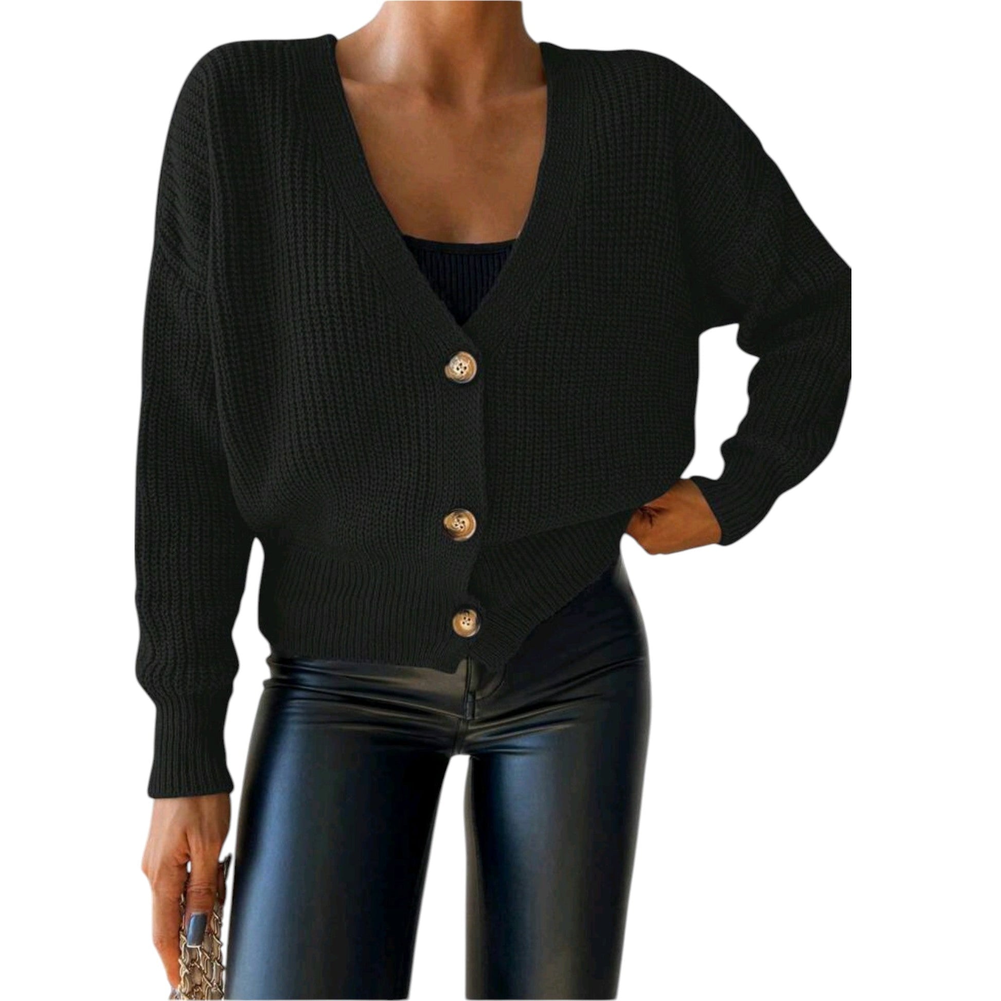 Címke nélküli, fekete, bordázott kötésű, V-nyakú, gombos, hosszú ujjú.