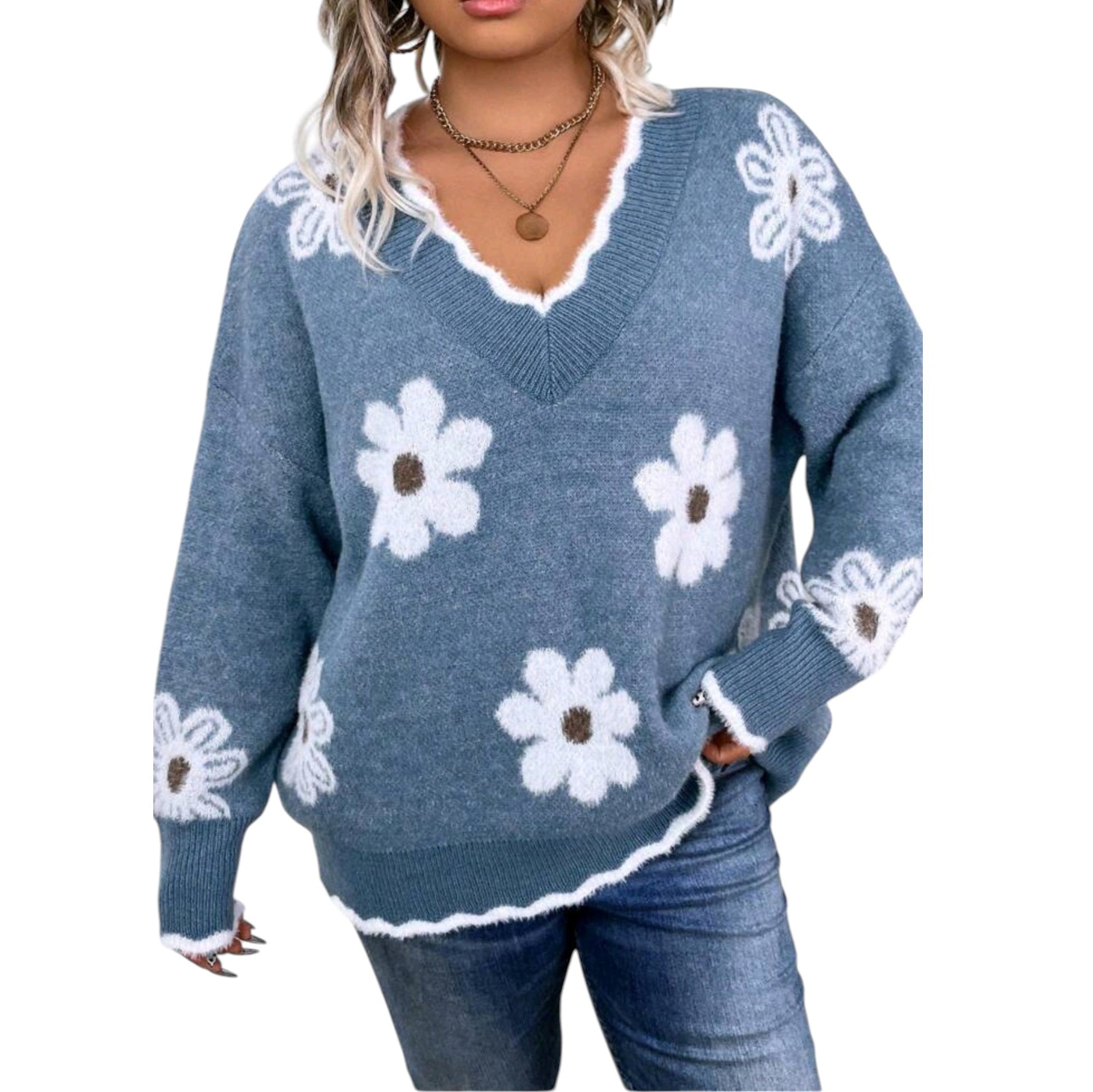Címke nélküli, kék, fehér virágmintás, V-nyakú, fodros szélű, hosszú ujjú.